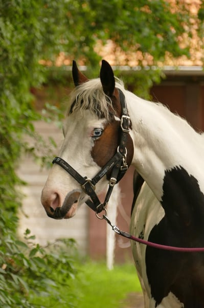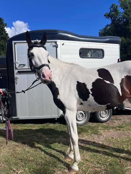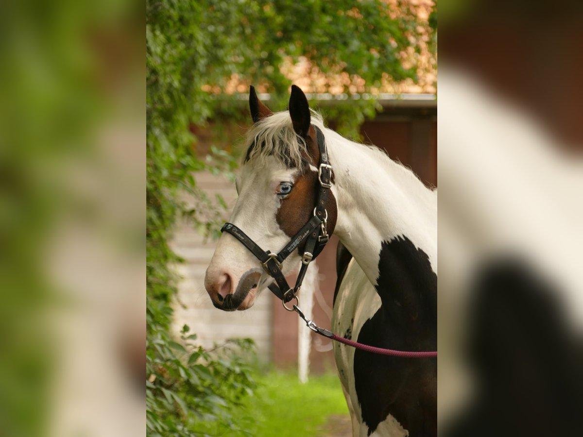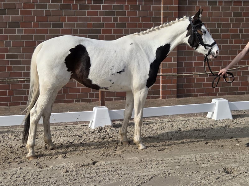 Talented Pinto Mare for Sale – Perfect for Show Jumpers and Pinto Enthusiasts The mare is purebred (homozygous). As a foal, she was awarded as a Brilliant Foal with an overall score of 8.6. For sale is the 6-year-old mare "Vision of Dreams," affectionately called Dreamy or Dreams. Dreamy is a genuine pony mare who loves to be the center of attention. Her charming personality makes her very likable. She is approximately 155 cm tall and comfortably carries larger riders – the rider in the photo is 1.79/1.80 m tall. She has been under saddle since June of last year. Prior to that, she was carefully brought along through trust and ground work to establish a solid foundation for her further training. She is always eager to please her rider but also displays the typical pony character, requiring clear and consistent leadership. She is not suitable as a children's pony, as she needs a rider who can provide her with confidence and security. In dressage, she is confident in walk, trot, and canter. Transitions, lateral work, and bending are regularly practiced. She is familiar with lunging, the longe line, and is well-socialized within her herd. She has already completed some small jumps and stang work is a regular part of her training routine. Since gentle and age-appropriate training is a priority, she is given the necessary time for physical and mental development. We are seeking a 5-star home for this special mare – ideally for someone who wishes to further develop her skills and grow together. We envision a home where she will be both challenged and supported, receiving love and attention. To prevent riding tourism, we charge €30 for trial rides, which will be deducted from the purchase price. As she is still in training, the price will increase with further education and performance. Thanks to her excellent pedigree, she is also very interesting for future breeding. If genuinely interested, we look forward to hearing from you. For inquiries or further information, please feel free to contact me.