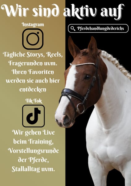 Luna ist eine 2018 geborene Stute ca. 162cm *Luna* ist eine wunderschöne Allrounderin. Sie ist schön zu reiten und zeigt sich mit schönen Bewegungen, die super zu sitzen sind. Luna geht brav alleine und in der Gruppe ins Gelände, ist total unerschrocken und cool. Im Wasser hat sie Spaß und auch das Gelassenheitstraining macht sie entspannt mit. !!! SCHAUEN SIE SICH UNBEDINGT IHR VIDEO AN !!! Eine tolle Allrounderin die bei allem Freude macht. Ein aktuelles Video finden Sie hier in der Anzeige oder unter folgendem Link: https://www.youtube.com/watch?v=d_yhBhyeukg Pferdehandlung Dederichs – Ihr Partner für den Pferdekauf Kontakt & Erreichbarkeit: Anfragen bitte ausschließlich telefonisch unter 0173/9792139 Montag – Freitag: 09:00 – 18:00 Uhr Samstag: 09:00 – 15:00 Uhr Sonntag: Ruhetag Folgen Sie uns auf Social Media! Erleben Sie unseren Alltag mit den Verkaufspferden auf Instagram, TikTok & Facebook unter Pferdehandlung Dederichs Rabatt: Bei sofortiger Mitnahme Ihres neuen Traumpferdes erhalten Sie zwischen 5 %– 10 % Rabatt Probereiten & Vorführen: • Probereiten: 30 € pro Pferd (max. 2 Reiter), Betrag wird beim Kauf angerechnet • Feiertage: Proberitt 50 € • Vorführung durch unsere Bereiter: 25 € pro Pferd (Vorreiten, Bodenarbeit etc.) Ankaufsuntersuchung & Transport: • Viele unserer Pferde besitzen bereits eine AKU • Sie können selbstverständlich Ihren eigenen Tierarzt mitbringen • Gerne organisieren wir eine Untersuchung • Wir unterstützen Sie auch gerne beim Transport ins neue Zuhause Weitere Verkaufspferde: In unserem Stall stehen weitere Verkaufspferde, die noch nicht online sind. Falls Ihr Traumpferd noch nicht dabei ist, zögern Sie nicht, uns zu kontaktieren. Wichtige Hinweise: • Stockmaß-Angaben sind geschätzt und nicht exakt nachgemessen • Alle Beschreibungen sind subjektive Einschätzungen des Verkäufers und keine zugesicherten Eigenschaften Weitere Informationen finden Sie unter: www.Pferdehandlung-Dederichs.de