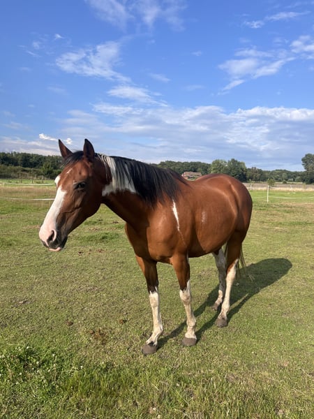 Die hübsche Amy sucht ein neues Zuhause. - Stute - 8 Jahre - ca 1,58m groß - Papiere vom ZSSE mit voller Abstammung - nicht geritten - gedeckt vom Quarter Hengst (Jeannes Happy Light) für 2026 Amy hat in ihrem bisherigen Leben noch nicht viel gemacht, also ein echter Rohdiamant. Sie stand bis 4 jährig auf einer großen Weide mit viele Artgenossen. Danach kam sie in eine Familie und ging oft als Handpferd mit ins Gelände und wurde longiert. Es fehlte aber die Zeit sie auszubilden. Aktuell steht sie in einer Stutenherde im Offenstall, kennt aber auch Box und gemischte Herden. In der Herde ist sie unkompliziert und Rangniedrig. Sie hatte schon einen Sattel auf dem Rücken und wurde damit longiert. Sie ist ziemlich sensibel und neuen gegenüber erstmal skeptisch, aber immer händelbar. Sie schaut dann, aber rennt nicht los oder so. Sie braucht eine konstante Bezugsperson, dann geht sie überall mit hin. Wer ein Pferd zum selber ausbilden sucht ist bei ihr richtig. Bei Fragen oder zum kennenlernen gerne melden