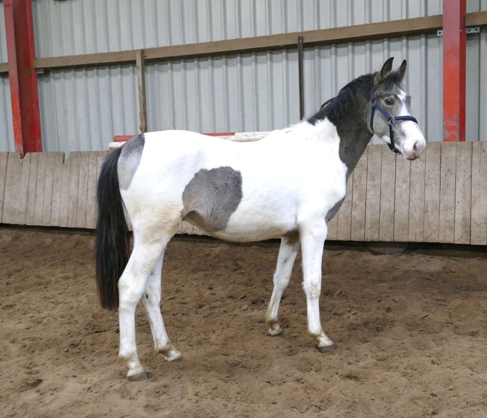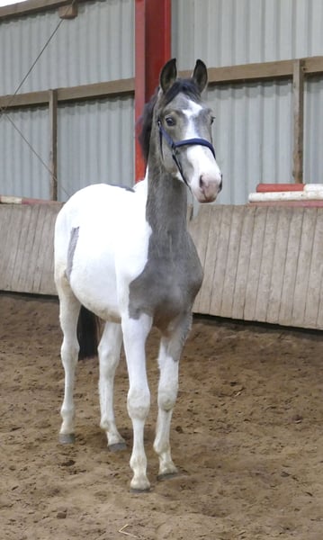 Miradon ! Âgé de 1,5 ans, parfaitement développé, avec un caractère adorable et amical ! MIRADON A – cela signifie « aimer le bon ». Né en 2024, Miradon est un fils de Michelangelo, issu de Ismo's Emi, une fille d'Ismo x Shakespeare x Potsdam NRW. Il est la demi-sœur du cheval de reproduction Cadiz. Nous estimons sa taille finale à environ 168 cm. Un jeune cheval très prometteur, en buckskin tobiano, idéal pour le concours complet et le saut d’obstacles !