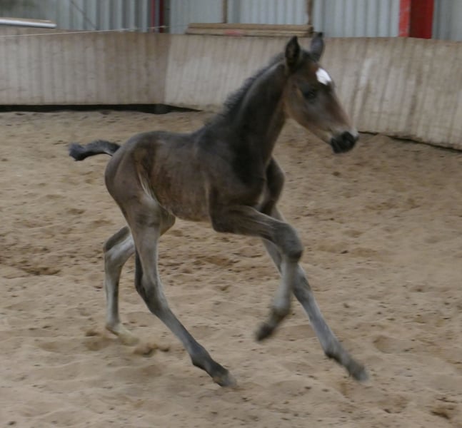 Corvin A – schwarzbraunes Hengstfohlen mit hochkarätiger internationaler Springabstammung. Ausgestattet mit drei sehr guten Grundgangarten, viel Elastizität und auffallender Bewegungsqualität präsentiert sich Corvin A als hochmoderne Nachwuchshoffnung für den Spring- und Vielseitigkeitssport. Sein Pedigree vereint bewährte Leistungsblutlinien: Väterlicherseits führt er über Cadiz (Cordess–Clinton) wertvolles Clinton- und Heartbreaker-Blut, kombiniert mit Shakespeare und Potsdam NRW. Die Mutterlinie bringt über Chaman (Baloubet du Rouet x I Love You) sowie Ismo (Ilasso x First Gotthard x Zeus) weitere international erfolgreiche Springgene ein. Ein sehr modernes, langbeiniges Hengstfohlen mit viel Übersicht, Kraft aus der Hinterhand und sportlichem Auftreten – hochinteressant für ambitionierte Reiter und den gehobenen Sport. Corvin A von Cadiz (Cordess-Clinton x Heartbreaker x Shakespeare x Potsdam NRW) x Chaman (Baloubet du Rouet x I Love You) x Ismo (Ilasso x First Gotthard x Zeus).
