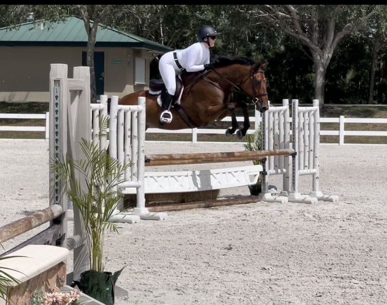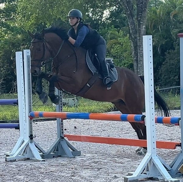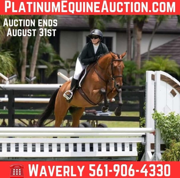 ONLINE AUCTION Place your bids at www.PlatinumEquineAuction.com Starting Bid $3500 Auction ends August 31st, 2025 Need a new saddle? Check out White Rock Saddles on our website or Facebook Joey is a 11 year old, 16.1h, refined WB/TB cross that has successfully competed at the 2’6″ height and recently won a 2’6″ hunter derby. He is not a packer or lesson horse type and requires an advanced/experienced ride over fences. He is super comfortable to flat, a well educated push ride and knows basic lateral movements. He would make an excellent practice equitation horse where his environment does not change much. He will hack out with another horse. He does have ground quirks with mounting and needs sedation for the farrier/clipping. Requires stifle injections and regular chiro/magnawave maintenance. Located in Loxahatchee, FL. Call for more info Waverly Ernst 561-906-4330 ONLINE AUCTION Place your bids at www.PlatinumEquineAuction.com Starting Bid $3500 Auction ends August 31st, 2025 Need a new saddle? Check out White Rock Saddles on our website or Facebook