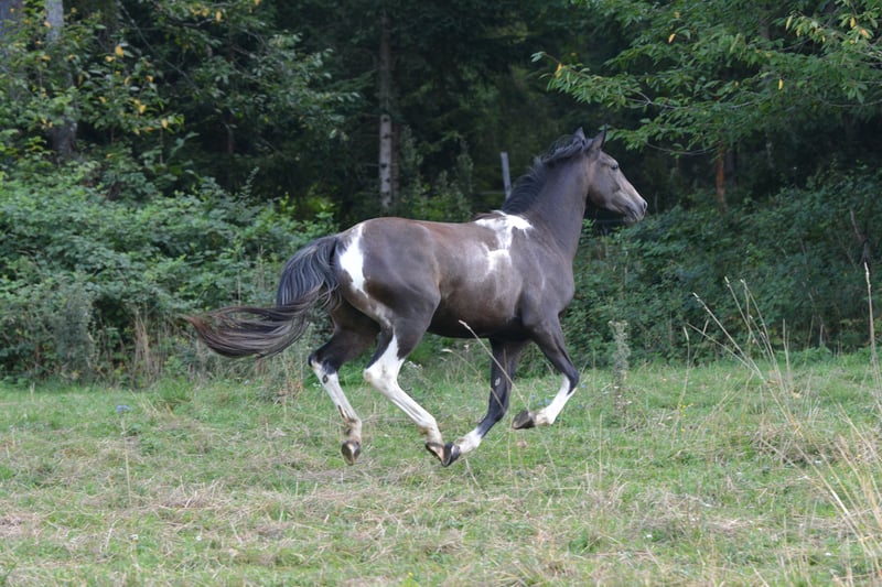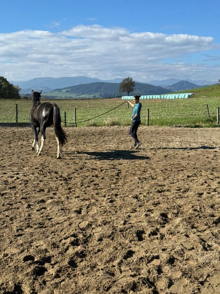 DATA & PEDIGREE: • Warmblood – Arabian – Crossbreed • Mother: Nonius Cross, Father: Partbred Arabian stallion "Norcal Sierra Snoman" • Born: April 27, 2023 • Harmonious conformation, correct foundation, final height approximately 16.0 hh • Very good hooves, easily navigates rocky terrain • Black-brown pinto – will turn grey with age • Calm, loving temperament, very affectionate and people-oriented, also very playful • Has successfully undergone treatment for a Gnat allergy (via ASIT immunotherapy) IT IS WITH A HEAVY HEART THAT I MUST PART WITH MY ADORABLE, LOVING GELDING TARAN. Originally, he was born as a playmate for the foal of my breeding mare, and I initially planned to sell him as a one-year-old. However, his loving nature quickly won me over, and I decided to keep him and continue his training. Now, I find myself at a point where I realize I lack the time to give him the attention and development he deserves. Therefore, I am looking for someone who can provide him with exactly that. Taran wants to please his human and works with great joy and motivation. Despite his young age, he already knows quite a lot: - **Trail riding:** I regularly took him out on walks and as a lead horse in all three gaits, always well-behaved and reliable, whether alone or in company. Even without herd contact, he remains calm and composed. - **Desensitization training:** Through targeted exercises, he remains relaxed around umbrellas, tarps, spray bottles, etc. He shows no fear when saddling or wearing cooling blankets. - **Groundwork:** I have worked with him on leading, forehand and hindquarter turns, sending away, loading, and some Parelli games. - **Lunging:** He is easily lunged, understands walk, trot, and side-passing. - **Transport:** He enters the trailer fearlessly and calmly. Additionally, Taran impresses with his beautiful appearance. As a black-brown pinto, he will gradually turn grey as he ages, being a mixed-color grey. With a final height of about 16.0 hh and his harmonious build, he is truly eye-catching. I place great importance on healthy, well-balanced hooves and have been trimming his hooves every four weeks from the start. To prevent errors, a professional checks his hooves every few months. Thanks to regular trimming, he has very strong, healthy hooves and moves easily over rocky ground. He is very well-behaved during trimming, as he has been accustomed to it since his first month of life. At six months old, he developed an allergy to gnats, which has been successfully treated with ASIT immunotherapy. Since then, he has been almost symptom-free and shows almost no itching at his mane and tail anymore. Otherwise, he has no health issues. I am happy to provide more details about his treatment in a personal conversation. He currently lives in a harmonious herd in an open stable with 11 other horses, fitting in very well. He is somewhat lower in rank and quite playful. If you are looking for a loyal lifelong partner—a horse that impresses with its cheerful, eager-to-learn, and heartfelt nature and can be shaped according to your own ideas—Taran will be your ideal companion. Additional photos, videos, and information, as well as viewing appointments, are available upon request at 0650 3904002.