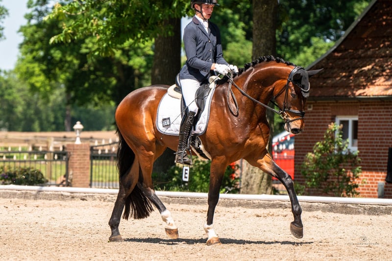 “So Fine” ist ein 4 jähriger Wallach, der seinem Namen alle Ehre macht. Er begeistert im täglichen Training, im Umgang sowie auf dem Turnier. Behutsam ausgebildet konnte sich der 1,73m große Sir Donnerhall Sohn in diesem Jahr gleich 3 Mal in Serie in Reitpferdeprüfungen platzieren! So Fine entspringt einer der besten Stutenfamilien- seine Mutter “Liebeskind” abstammend von Lord Loxley x Fidermark, ist eine Tochter der “Fair Play RB NRW” die international siegreich in Grand Prix Prüfungen ist. So Fine wird direkt aus Züchterhand verkauft und verfügt über einen sehr guten Röntgentüv. Abstammung: Sir Donnerhall l x Lord Loxley x Fidermark x Brentano ll