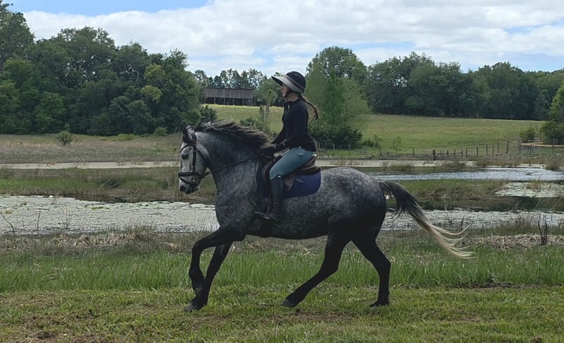 Stormy, hongre de 5 ans, 1,65 m, gris pommelé, croisement de cheval de sang chaud et de cheval de tr