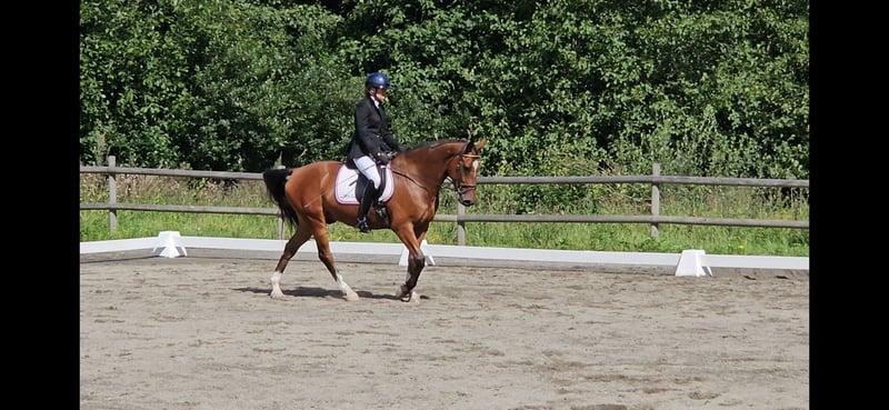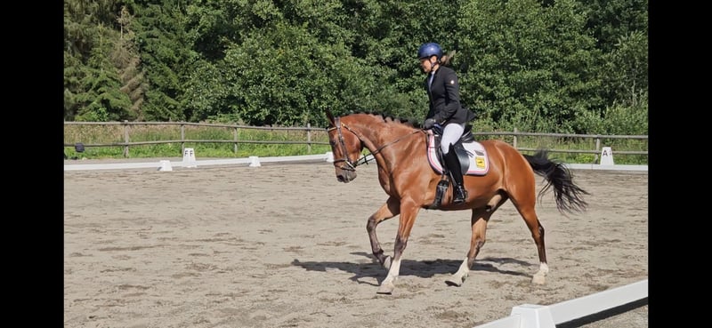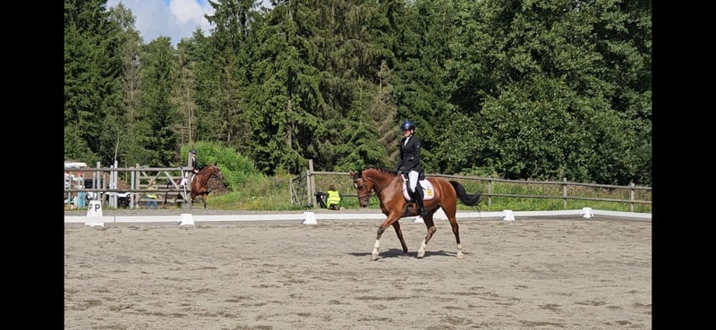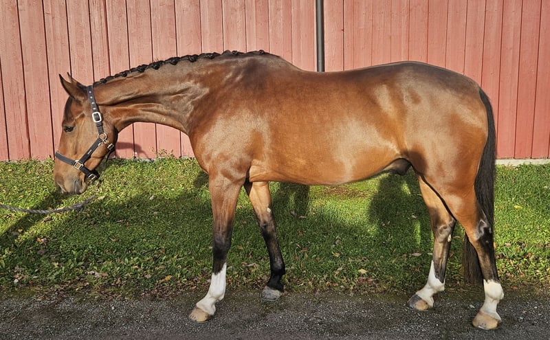 Der Wallach, geboren 2019 von Tobajo Picez (sprang internationale Jugendreiterklassen und absolvierte später internationale Dressur-GP sowohl für junge Reiter als auch für Senioren) aus Stansfield, einer Goodtimes-Stute. Stansfield sprang International GP sowohl für Junioren als auch für Youngrider mit vielen verschiedenen Fahrern. Gjeteruds Picadilly ist sehr rittig und erzielte dafür im nationalen Finale der Vierjährigen 8 Punkte. Er hat auch eine gute Technik und ist leicht zu den Sprüngen zu reiten. Er trat in vierjährigen Springen (100 cm) an. Er hat gute Grundgangarten und seine Flacharbeit ist großartig. Er macht Legyields leicht, und sein Züchter (der über 60 Jahre alt und ein Amateur ist) reitet ihn jede Woche in Flacharbeit und wurde in einer Dressurschau der ersten Klasse platziert. Das Ergebnis qualifizierte sich sogar für "Breeders Open" für Vierjährige in der Dressur. Er ist ein super Kandidat für Youngster-Klassen, und da er ein so tolles Temperament und Rittigkeit hat, würde er sogar für jemanden passen, der von Ponys aufsteigt. Er wurde bereits von einem Ponyreiter geritten, und es gab ein breites Lächeln und keinen Flaum. Würde auch perfekt als Mutter-/Tochter- oder Sohn-Sharing passen.