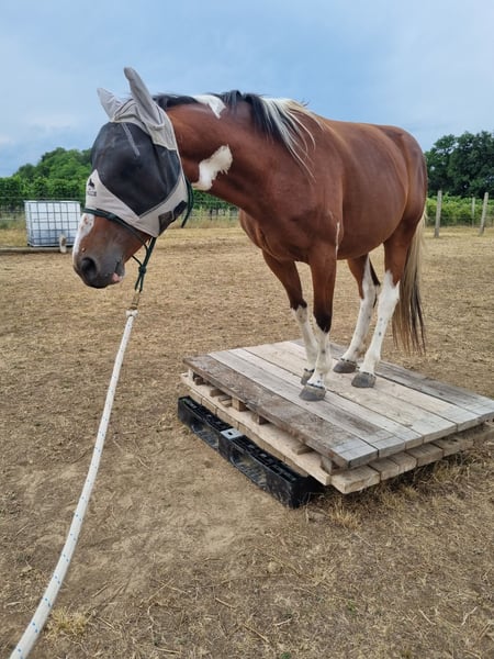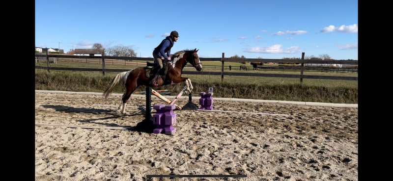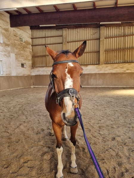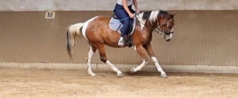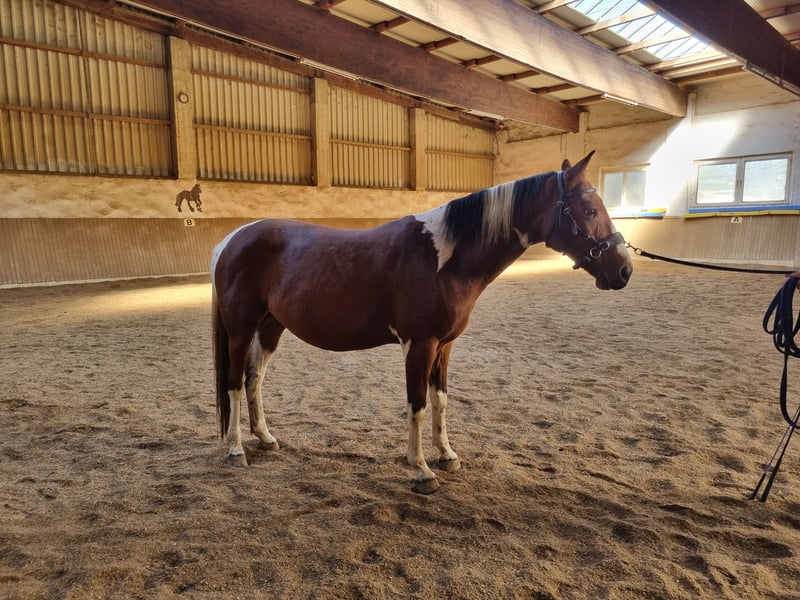 With a heavy heart, I am selling my 7-year-old Pinto gelding (hunter type). I have to admit that we are not a good match when it comes to riding. Training: He is worked in leisure riding with dressage elements, learns very quickly, and shows a lot of talent. He already masters lateral movements in walk, and shoulder-in and leg-yield have been introduced in trot. Overall, he is approximately at A-level dressage. He can also be ridden by beginners, but he requires a steady contact and engagement from the rider to go nicely. He has also been jumped by his previous owner. Groundwork is his particular strength—whether classical groundwork, Natural Horsemanship, lunging, liberty work, or small tricks, he enthusiastically participates in everything. In the field, he behaves very well in a group; alone, he can be a bit unsure at faster gaits. Temperament: He is a gentle, affectionate gelding with a lot of personality! He is dominant within the herd and may test new people initially. He tends to be more sensitive to his environment and can react fearfully in new situations (a quick jump to the side or a few canter strides), but he remains controllable at all times. Because of this, he can sometimes be challenging in terms of handling, but after a few months, it was no longer an issue for me and my riding partner. He does not buck or bite. Health & Care: A pre-purchase exam including X-rays from January 2024 is available and can be viewed. He is barefoot with good hoof material, requiring no shoeing or hoof boots. Currently kept in a herd in an open stable with 24/7 hay access, but he is also familiar with box stall housing. Teeth were done in May 2025. Regular deworming and vaccinations are up to date. He tends to water colic. He has several sarcoids (chest, face, armpits) and auricular plaques. This currently does not affect him, and according to veterinarians, treatment is possible. I am happy to provide personal details about this. He is being sold well below value because of this. Additional information: For trial riding, I ask for a fee of 30 EUR to prevent riding tourism. This amount will be credited upon purchase. Multiple visits and getting to know each other are welcome. Equipment can be purchased separately (saddle, blankets, bridle, etc.). I am selling him as a leisure horse; no sales to dealers! Of course, a new pre-purchase exam can be arranged by the buyer. Feel free to contact me via email or WhatsApp. Videos are available upon request.