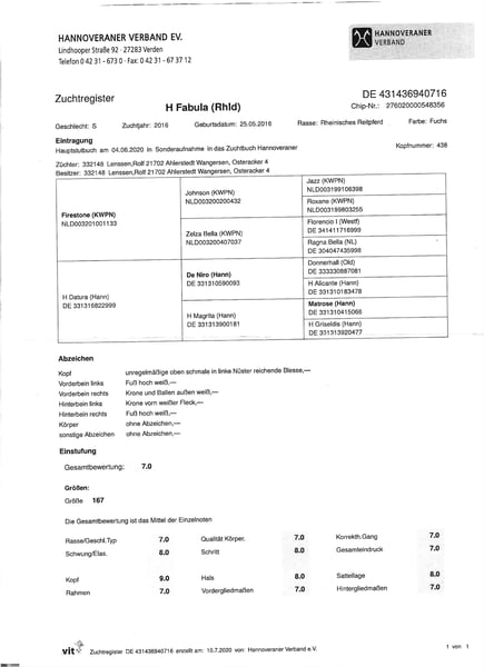 Beautiful Broodmare Fabula is a 10-year-old Rhineland Riding Horse mare. She has been in my possession since foalhood. During a breeding season, she had a foal but was not bred again due to lack of space. Fabula is registered with the Hanoverian Verband in the breeding register. Due to an accident in the pasture, she has not been ridden or formally trained; she is, of course, familiar with lunging. The farrier works with her calmly. I would like to be transparent about a quirk she has: she is quite sticky when haltering. Traveling in a trailer is only possible with two people. She is very people-oriented and easy to handle with other horses. I am offering her for sale because I no longer wish to breed. For inquiries, please contact me at 0157 74046827.