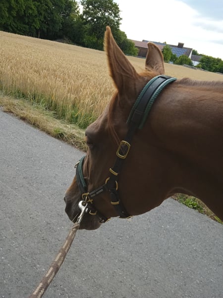 Emmi is a 12-year-old mare, approximately 15.5 hands tall. Her passport lists her as a warmblood without a specific breed designation; she likely has a significant Arabian influence. The "Cinnamon Roll" is very sweet and affectionate, but also has the necessary spark in her temperament. Her previous owners kept her in a box and rode her English. We purchased her in February 2025, but so far have only worked with her from the ground, as we are still gaining confidence in riding. She is housed in an active stable where her ample movement benefits her. Initially, she was quite spooky, but this has improved significantly. In training, she responds very delicately and wants to do everything correctly. We also took her on many walks; she moves very confidently and securely in the terrain and has never bolted. She is barefoot, chipped, vaccinated, with her teeth recently checked in autumn, and has had two physiotherapy assessments. Due to family reasons, we unfortunately have to part with her again. We hope she can stay at the Aktivstall Schwabhof in Genderkingen or find a new home where she can have time to settle in and build muscle before starting to ride. Additionally, her accessories can also be sold, including a brand-new Signum paddle. If interested, please feel free to contact us.