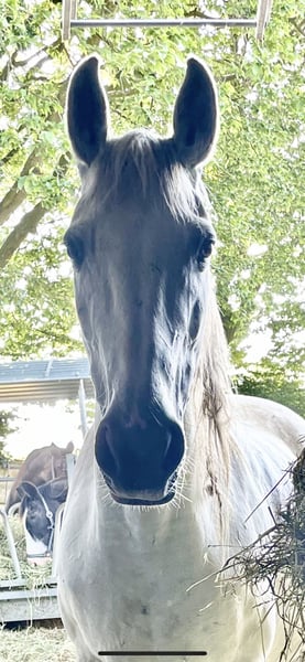 Bijzetmerrie, onbeslagen, ter goede handen weg te geven. 14 jaar oud, porseleinkleuren schimmel, niet goed belastbaar vanwege de rechterheup, verder heeft ze daar geen problemen mee. Aanzetten op de longe is mogelijk. Kan ook voor de fokkerij gebruikt worden, maar ze heeft geen papieren. Laden met lichte sedatie is mogelijk. Ze staat in Auw bij Prüm op een weiland. Ze gaat graag samen met merries, maar momenteel ook met hengsten. Ze kan daar ook blijven indien gewenst. Ongeveer €150 per maand. Bij vragen, neem gerust contact op.