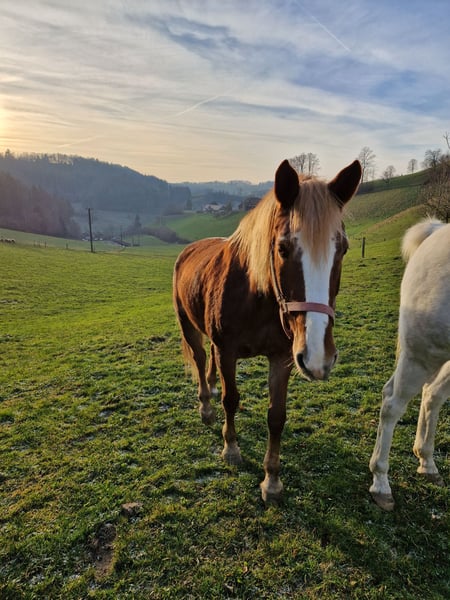 Leider muss ich für meine 18-jährige Holländerstute ein neues Zuhause suchen, da sie sich bei mir im Zweierstall als Herdenchefin nicht wohlfühlt. Die ca. 153cm grosse Stute ist absolut brav im Umgang sowie auch beim Reiten. Sie ist gesund und barhufer. Bevor ich sie kaufte, lief sie in einer Reitschule. Auch bei mir wird sie regelmässig von Mädchen geritten, wobei sie sehr brav ist. Auch für den Einsatz als Therapiepferd würde sie sich durch ihre ruhige Art eignen. Allerdings ist sie ein absolutes Herdenpferd, weshalb ich sie nur in einen Offenstall gebe und auch nur in eine grössere Herde. Sie mag es gar nicht alleine im Stall zu warten, wenn kein anderes Pferd da ist. Alleine ausreiten geht, aber auf den letzten Metern hat sie Stalldrang. Am liebsten geht sie in der Gruppe ins Gelände, wo sie auch sehr verkehr-und geländesicher ist. Sie hat keinerlei Unarten wie Bocken, Steigen oder Durchbrennen. Hat aber auch mal ihren eigenen Kopf und testet ihren Reiter anfänglich. Deshalb ist sie nicht geeignet für blutige Anfänger, ausser sie wird an der Longe geführt. Gerne gebe ich auf Anfrage weiter Auskunft und ein Besichtigen und Probereiten ist jederzeit möglich. Zuhause sind wir im Aargau. Der Preis für die Stute liegt bei 3'500.-. Mit Sattel und allem Zubehör 4'300.-