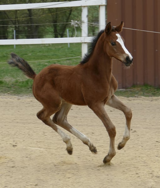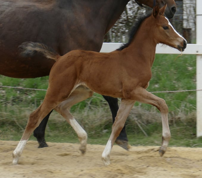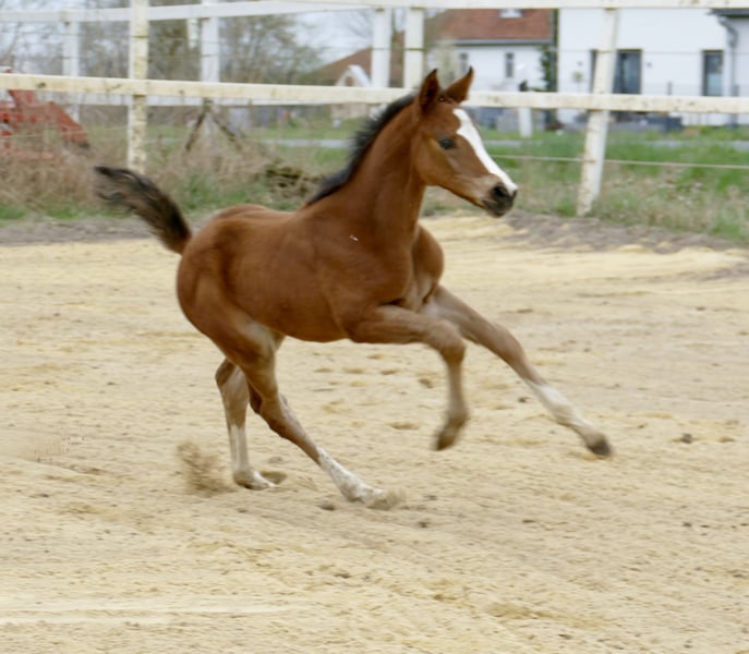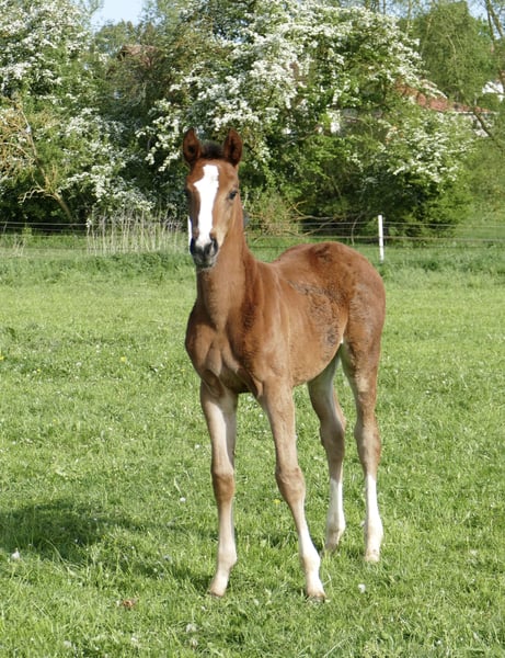 Today I would like to introduce you to Calea A, a typy, large filly. Her name means "the happiness, full of joy." She is sired by Cadiz (Cordess-Clinton x Heartbreaker x Shakespeare x Potsdam NRW) x Ismo (Ilasso x First Gotthard x Zeus) x Capilano (Capitol x Landgraf). A sporty eye-catcher for eventing and show jumping.