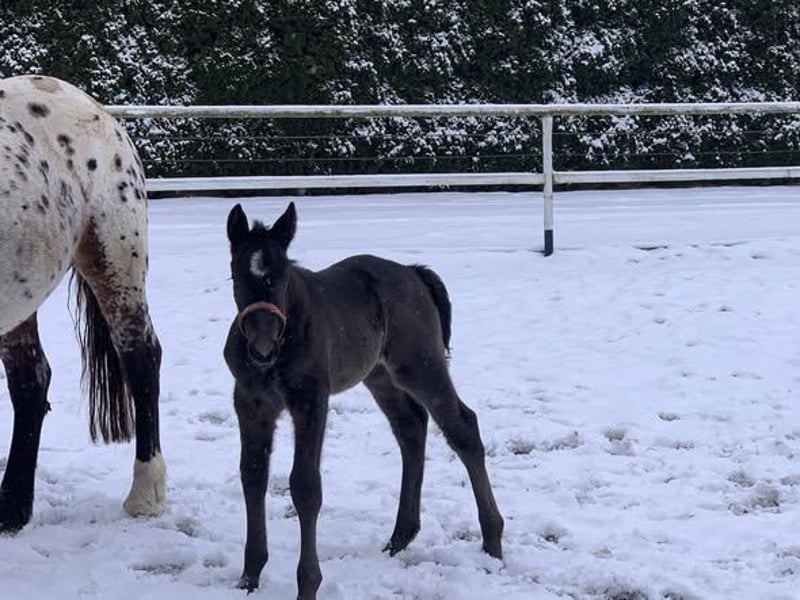Jument tachetée de tigre de 4 ans, 1,64 m, avec un poulain de l'étalon