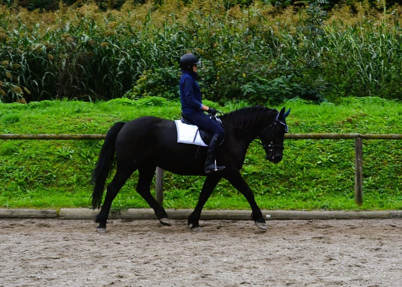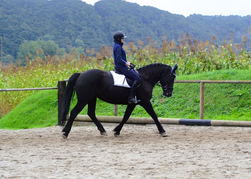 This beautiful, kind-hearted black mare with a dark coat impresses with her honest character and three good gaits. She provides a secure riding feeling and is lovable with a great attitude. Ariane is familiar with the arena, the outdoor ring, and trail rides alone or in company.
