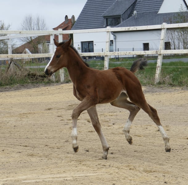 Heute möchte ich euch Calea A vorstellen, ein typvolles, großes Stutfohlen. Ihr Name bedeutet "das Glück, voller Freude". Sie stammt von Cadiz (Cordess-Clinton x Heartbreaker x Shakespeare x Potsdam NRW) x Ismo (Ilasso x First Gotthard x Zeus) x Capilano (Capitol x Landgraf). Ein sportlicher Hingucker für Vielseitigkeit und Springsport.