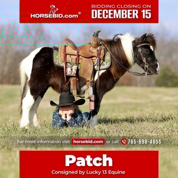 🎄𝐓𝐇𝐄 𝑯𝒐𝒍𝒊𝒅𝒂𝒚 𝐂𝐋𝐀𝐒𝐒𝐈𝐂🎄 Happening now thru MONDAY | DECEMBER 15th - Available EXCLUSIVELY on HorseBid's website! For more details and to register visit: www.Horsebid.com CONSIGNOR CONTACT: Lucky 13 Equine 765-698-4655 LOCATION: Mount Vernon, KY BREED: Pony REGISTERED: No REGISTERED NAME: Patch COLOR: Black and white paint HEIGHT: 36 inches AGE: 10 GENDER: Gelding Meet Patch, a 10-year-old black and white gelding standing 36 inches tall with a heart big enough for any adventure. This little guy has countless trail miles under his feet and has proven himself time and time again to be steady, dependable, and willing. Patch has been trail ridden through herds of cattle, down country roads, and all through local state parks. He crosses creeks, ditches, and obstacles without hesitation or spook and will go anywhere you ask him to go. Whether he’s out alone or in a group, Patch stays the same confident, calm, and uncomplicated. And if you’re not in the mood to ride? Hook him up and take him for a drive! Patch is just as enjoyable in harness as he is under saddle, making him a versatile little gelding with a big work ethic. Patch is the kind of pony that’s hard to find experienced, trustworthy, and always ready for the next ride or drive. Don’t miss the chance to make him part of your family!