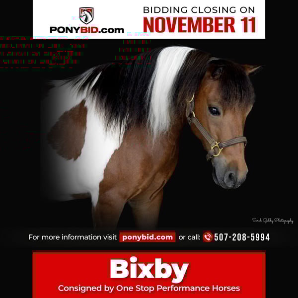 𝓽𝓱𝓮 𝐑𝐈𝐃𝐄𝐑'𝐒 𝓒𝓱𝓸𝓲𝓬𝓮 🐴 𝐏𝐎𝐍𝐘 𝐄𝐃𝐈𝐓𝐈𝐎𝐍 🐴 Happening now thru TUESDAY | NOVEMBER 11th - Available EXCLUSIVELY on Ponybid's website! For more details and to register visit: www.Ponybid.com CONSIGNOR CONTACT: One Stop Performance Horses 507-208-5994 LOCATION: Oelwein, IA BREED: Pony REGISTERED: No COLOR: Bay & White paint HEIGHT: 39" AGE: 10 GENDER: Gelding Bixby is the kind of pony every parent hopes to find, and every child dreams of having. He has a gentle and forgiving old soul, and never gives any funny pony business. He’s like a full sized school horse in a 39” package. He travels around level headed, and is respectful enough in the bridle guide around with ease. He is never too forward, never strong willed, and always patient. Bixby is easy to do everything with. He is easy to catch, halter and lead for the little ones. He ties, cross ties, bathes, clips, and will stand for hours to be groomed and doted on. He is easy for anyone to tack up or harness & hitch. He will ride off by himself or with a group of big horses. Great on trails, cross water, in the arena, or just out playing in the yard or open fields. He is easy to load & haul and is great in even the most chaotic environments. Besides all the fun to be had with him riding, Bixby is a joy to drive. He is 100% traffic safe, you can drive him absolutely anywhere. From high traffic arenas, to the country roads, highways, or right into town to the local ice cream shop or park. And just like his riding, he drives around level headed, on a slack rein and never gives a fuss. He is just and absolute joy. Bixby is a very easy keeper and will fit right in to any home. Whether stalled, private turnout, or living in a mixed herd of big horses. He requires nothing special and is very content in any living situation and conditions. And his big kind eyes and adorable face will make your heart smile every time you see him. The world would be a better place if every pony was just like Bixby