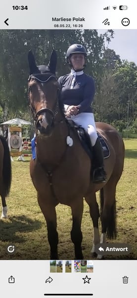 Spock est un hongre sportif et de grande taille, doté de bonnes manières et très câlin. Il peut être monté en dressage même par des cavaliers moins expérimentés. Son talent en saut d'obstacles n'a pas de limites, mais il nécessite une main ferme. Ce hongre a déjà été présenté et classé en épreuves de saut en classes A et L. Si vous avez des questions ou si vous souhaitez nous préciser le type de cheval que vous recherchez, n'hésitez pas à nous contacter via WhatsApp au 0176 43809132. Nous vous répondrons au plus tard le lendemain.