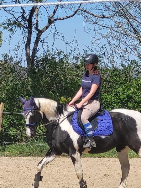 Wir verkaufen unseren 18 Jährigen Wallach. Da er rangniedrig ist steht er in einer Box, im Sommer aber immer mit zwei anderen Pferden auf der Wiese. Wir hatten ihn zuerst im Offenstall stehen, da wurde er aber von den anderen Pferden gemobbt. Er wehrt sich nicht und lässt alles mit sich machen. Beim Putzen und beim Hufschmied ist er brav. Meistens geht er auch bei dem zweiten Versuch auf den Hänger. Die Pferdewaage kennt er auch. Man kann ihn auch super als Handpferd nehmen. Halle und Platz kennt er, Gelände geht er nur mit anderen. Er ist kein Anfänger Pferd und braucht einen Reiter der ihm Sicherheit gibt. Zu Beginn testet er besonders im Gallopp die reiterlichen Fähigkeiten aus. Man kann mit ihm Boden/ bzw. Stangenarbeit machen, longieren, springen und Dressur reiten. Das reiten mit Pad oder ohne Sattel ist er auch gewöhnt. Wir haben auch schon vermehrt an working equitation Lehrgängen teilgenommen.