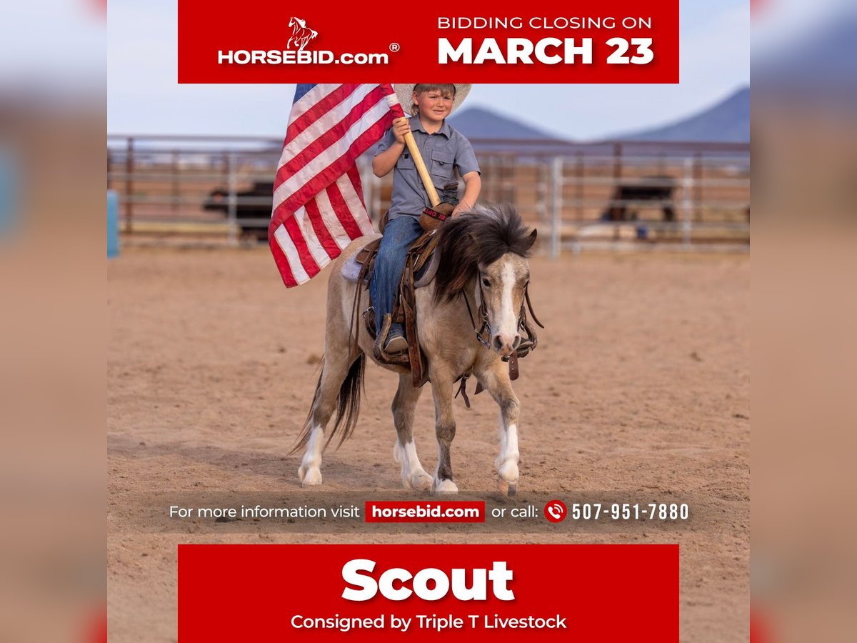 ⚜️𝓽𝓱𝓮 𝐆𝐎𝐋𝐃 𝓢𝓮𝓵𝓮𝓬𝓽⚜️ Happening now thru MONDAY | MARCH 23rd - Available EXCLUSIVELY on HorseBid's website! For more details and to register visit: www.Horsebid.com CONSIGNOR CONTACT: Triple T Livestock 507-951-7880 LOCATION: Aguila, AZ BREED: Pony REGISTERED: No COLOR: Buckskin HEIGHT: 42 inches AGE: 4 GENDER: Gelding Scout – The Kind That Makes Kids Fall in Love with Ponies Scout is a 4-year-old buckskin pony gelding that stands 42 inches tall and is absolutely as cute as they come. With his golden buckskin color, kind eye, and friendly personality, Scout is the type that quickly becomes everyone’s favorite around the barn. He’s the kind of pony that the kids run to the pasture for and the one that’s always happy to see you. Scout is broke to both ride and drive and has been used for just about everything around the ranch. He’s the definition of a versatile little pony — whether the kids want to saddle up and ride, hook him to the cart, or simply lead him around for an afternoon adventure. He has a cute little lope in the arena and is easy for kids to steer and enjoy. Outside is where Scout really shines. He has been trail ridden extensively and is confident traveling out on his own or with other horses. He’s been exposed to dogs, tarps, and the everyday activity of ranch life, and he takes it all in stride. He’s a handy little pony that can go do a job but is still gentle enough for the littlest riders. Scout has also learned a few fun tricks and has the sweetest personality you could ask for. We’ve owned him for the past few years and our kids have had an absolute blast with him. Whether you saddle him up, hop on bareback, hook him to drive, or simply let the kids lead him around, Scout stays kind, patient, and dependable. Ponies like Scout are hard to find — safe, useful, adorable, and genuinely fun to have around. If you’re looking for the kind that will build confidence, create memories, and keep everyone smiling, Scout is the one.