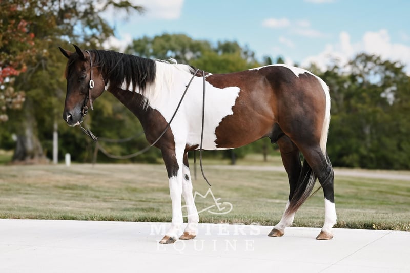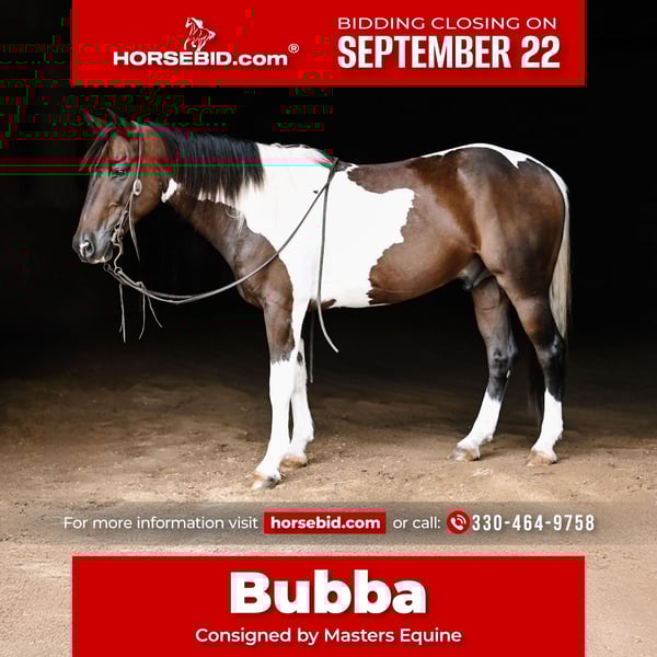 🍁𝒕𝒉𝒆 𝐅𝐀𝐋𝐋 𝑺𝒑𝒆𝒄𝒕𝒂𝒄𝒖𝒍𝒂𝒓🍁 Happening now thru MONDAY | SEPTEMBER 22nd - Available EXCLUSIVELY on HorseBid's website! For more details and to register visit: www.Horsebid.com CONSIGNOR CONTACT: Masters Equine 330-464-9758 LOCATION: Orrville, OH BREED: Quarter X Paint Pony REGISTERED: No COLOR: Paint HEIGHT: 14 AGE: 4 GENDER: Gelding Watch Video! Bubba is the kind of gelding that craves attention and loves to be around people. What I like most about him is his go-with-the-flow type of personality. He’s been arena ridden, has checked fence, and has plenty of outside miles under his belt. Versatile as they come, this classy-looking Paint gelding aims to please. With his size, disposition, and training, he would also make an excellent step-up pony for a youth rider ready to move on from a smaller mount. He does all of the obstacles- the teeter totter bridge, cowboy curtain, whips, tarps, gunfire, and flags are old news to Bubba. He has the brain of a horse twice his age and is very receptive to what is asked of him. Bubba is responsive to your leg and seat cues, with a fun turn around and a deep stop off your seat. While filming his video, we even took him over some small jumps for the very first time, and he handled them willingly and with ease. With his solid foundation and willing attitude, he could also be a great candidate for the english market. Bubba is a joy to have in the barn. He has been in both a stall environment and turned out on pasture with no bad habits. He is the perfect size for a rider with bad knees, as he is easy to get on and off, but stocky enough to carry almost any size rider comfortably. Pictures don’t do this cute gelding justice. He has good foot and bone, giving him the opportunity to have a long, successful career. He has been exposed to it all- farm machinery, equipment, road traffic, gunfire, deer, cattle- you name it. Bubba is sound and up to date on teeth, vaccines, coggins, and health papers. Since stepping foot on our property, he has been nothing short of a pleasure to work with. No matter what direction you want to go, this phenomenal gelding will be sure to take you there. He has all the buttons: side pass, turn around, leg yield, but can just as easily point and go. Gentle, flashy, and broke, with unlimited potential!