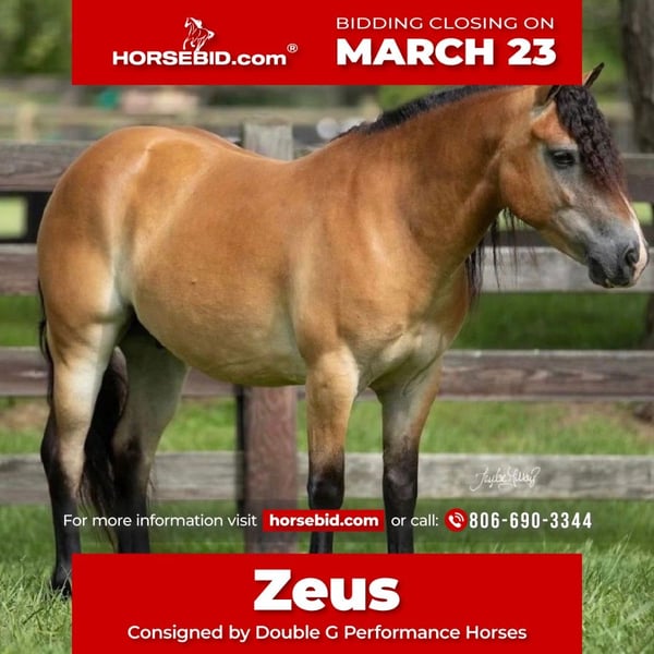 ⚜️𝓽𝓱𝓮 𝐆𝐎𝐋𝐃 𝓢𝓮𝓵𝓮𝓬𝓽⚜️ Happening now thru MONDAY | MARCH 23rd - Available EXCLUSIVELY on HorseBid's website! For more details and to register visit: www.Horsebid.com CONSIGNOR CONTACT: Double G Performance Horses 806-690-3344 LOCATION: Amarillo, TX BREED: Draft Pony across REGISTERED: No COLOR: Bay Dun HEIGHT: 13 AGE: 6 GENDER: Gelding Zeus is the absolute TOTAL package wrapped into a compact 13-hand body with the bone structure of a brick house. This 6-year-old bay dun gelding is gentle, honest, and the same horse every single day. He’s an easy keeper with a kind mind and a big personality that makes him a joy to be around. Zeus is the perfect candidate for a kid’s partner in crime or a family horse. Whether you’re trail riding on the weekends or putting him to work around the ranch during the week, he handles it all with ease. He rides quietly and confidently both bareback or saddled, and takes everything in stride—snow, rain, trails, or chores. What really sets Zeus apart are the extras. He steps over to the mounting block to help you get on and drives a cart, showing just how versatile and well-minded he is. He’s the type of horse that loves attention and being around people. Zeus is easy to catch in the pasture, stands quietly to saddle, and has no bad habits. He eats well, drinks well, and takes care of his rider every time. If you’re looking for a safe, dependable, and versatile gelding with a great mind, Zeus checks every box.