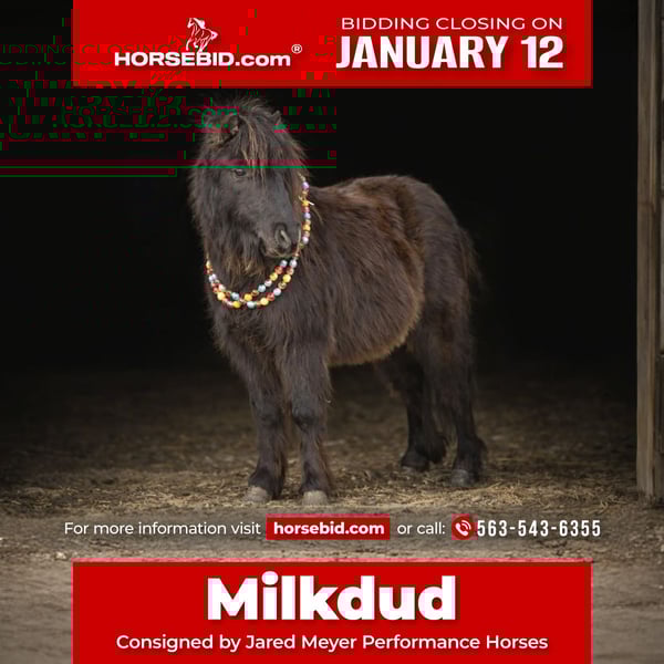 ♦️𝐍𝐄𝐖 𝐘𝐄𝐀𝐑'𝐒 𝑬𝒙𝒕𝒓𝒂𝒗𝒂𝒈𝒂𝒏𝒛𝒂♦️ Happening now thru MONDAY | JANUARY 12th - Available EXCLUSIVELY on HorseBid's website! For more details and to register visit: www.Horsebid.com CONSIGNOR CONTACT: Jared Meyer Performance Horses 563-543-6355 LOCATION: Bernard, IA BREED: Pony REGISTERED: No REGISTERED NAME: Milkdud COLOR: Black HEIGHT: 38 inches AGE: 7 GENDER: Gelding Milkdud is the kind of pony every parent hopes to find and every kid remembers forever. This 2019 black gelding stands right at thirty-eight inches and has been shaped the best way possible — by kids. He’s been ridden, loved, and outgrown by capable young riders, giving him the kind of solid, honest foundation that can’t be rushed or manufactured. Quiet, steady, and incredibly dependable, Milkdud is an extremely safe and gentle trail partner who takes care of his rider every step of the way. He rides out alone without hesitation, never makes a peep, and goes exactly where he’s asked. Sure-footed and confident, he’s been on trail rides, around cattle, and exposed to real-world situations that matter for a family pony. Milkdud is sturdy, good-minded, and well-suited for fit beginners or first-time horse owners looking for a pony their kids can truly enjoy. If you’re searching for a pony that builds confidence, keeps parents at ease, and creates lasting memories — Milkdud checks every box. 100% Sound, Safe and Gentle Questions or to schedule a time to see this horse, contact Jared Meyer at 563-543-6355.