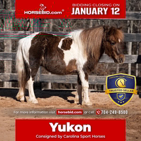 ♦️𝐍𝐄𝐖 𝐘𝐄𝐀𝐑'𝐒 𝑬𝒙𝒕𝒓𝒂𝒗𝒂𝒈𝒂𝒏𝒛𝒂♦️ Happening now thru MONDAY | JANUARY 12th - Available EXCLUSIVELY on HorseBid's website! For more details and to register visit: www.Horsebid.com CONSIGNOR CONTACT: Carolina Sport Horses 704-249-8500 LOCATION: Clover, SC BREED: Pony REGISTERED: No REGISTERED NAME: Yukon Cornelius COLOR: Paint HEIGHT: 40 Inches AGE: 8 GENDER: Gelding Yukon is a 10 hand , 8 yr old, Paint Pony Gelding….He is super easy and willing for the smallest of riders. Very nice walk, trot, and canter with a crop lol…He is a little lazy for the smallest kids but the older kids ride him like a big horse. He is fun and friendly in the barn and loves attention. Check out his video to see more! Yukon is the kind of pony every family dreams of — safe, steady, and wonderfully dependable under saddle. He gives a confidence-boosting ride every time, and his calm, kid-friendly temperament makes him a favorite with little riders and adults alike. Yukon absolutely loves attention, greets you with a happy attitude, and thrives on interaction both in the barn and out on the trail. This versatile pony isn’t just easy to ride — he also pulls a cart with enthusiasm and manners, making him a fun and capable partner for both riding and driving. Whether it’s a quiet walk around the arena or teaching kids the joys of horsemanship, Yukon takes it all in stride with a willing heart. Backed by the trusted name of Carolina Sport Horses, Yukon represents the kind of safety, quality, and grounded temperament we’re known for — horses that excel as family partners, confidence builders, and lifelong companions. *All of our descriptions are OUR OPINION and ARE NOT FACTS. They represent how the horse responded and behaved while in our care. Horses can change at any time as they are living, breathing animals. There are no warranties expressed or implied via the descriptions above*PLEASE READ OUR BUYERS GUIDE PRIOR TO BUYING OR BIDDING ON ANY HORSE WE HAVE AVAILABLE. Yukon is available to be seen at our farm in Clover, SC by appointment. Interested in bringing Yukon home? Give us a call today! Please take the time to read our Buyers Guide to answer any questions or concerns you may have. Contact Us Call or TEXT 704.249.8500