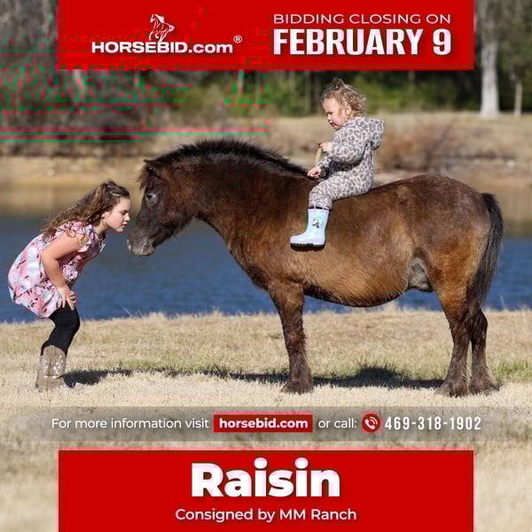 ❤️🔥𝑩𝒆 𝑴𝒊𝒏𝒆 𝐒𝐄𝐋𝐄𝐂𝐓❤️🔥 Happening now thru MONDAY | FEBRUARY 9th - Available EXCLUSIVELY on HorseBid's website! For more details and to register visit: www.Horsebid.com CONSIGNOR CONTACT: MM Ranch 469-318-1902 LOCATION: Forney, TX BREED: Pony REGISTERED: No REGISTERED NAME: Raisin COLOR: Bay HEIGHT: 10.2 AGE: 9 GENDER: Gelding 🦄 Raisin 🦄 is the ultimate babysitter bombproof kids pony that everyone in the family will love and can have fun with!! This short but extra wide guy is worth his weight in gold. 🏆 He is 10.2 hands tall and 9 years old. The perfect age and size to last kids for years. He is safe, docile, lovable and endlessly tolerant. This little guy is a barn favorite and is the one everyone flocks to because he is too cute and is always standing at the gate to greet you! He rides english or western. He has been rode countless miles up and down the road by traffic, around all kid of animals, and lots of noise. He is a been there done that type pony. He is a great well behaved pony no matter what he is doing in or out of the arena. He has done everything from playdays, all events, english jumping, used to teach beginners in lessons, ridden in parades and grand entries, rode on big trail rides, etc… and too much more to list. On trails, he will go up/down hills, through the woods, through different terrain and never miss a beat. He will help check cows and fence in the pasture. While riding English, he will go over small jumps at the speed you ask him to. For playdays, he is SAFE and will go through the events, he isn’t super fast but will keep little ones safe and let them have so much fun. He doesn’t get hyper, buddy sour or barn sour. He will ride out good alone or in a group. He is truly an all around pony. He is perfect for beginners needing to learn all the basics. Even if the child has never rode or been around a pony before, he will take care of them, every step of the way. You don’t have to worry about little ones making the mistake of going behind him or sticking their little fingers in their mouth… he will NOT kick or bite them. He is a meet you at the gate type of guy and is always ready to be loved on. Jump on him bareback or saddle him up and he is ready to go do what is asked of him. He does great as a companion pony with everyone, he is very well behaved and pens/pastures well with big horses, cows, donkeys, goats, etc. He has perfect ground manners for kiddos to learn to be completely independent. He stands tied great, loads in/out of the trailer well, stands to be mounted, picks up all 4 feet willing and stands for kids to clean each one out. The kids can climb all over him, stand up on his back, and he will never move a muscle. He is the type a kid will talk about the memories made with him FOREVER. He is a very easy keeper.. stays fat on air but has no health issues, has good hooves and has never foundered. He had a pre vet evaluation done and he is sound and healthy! (Vet evaluation picture is included) Please call with any questions, we love to talk about him and answer any questions you may have!