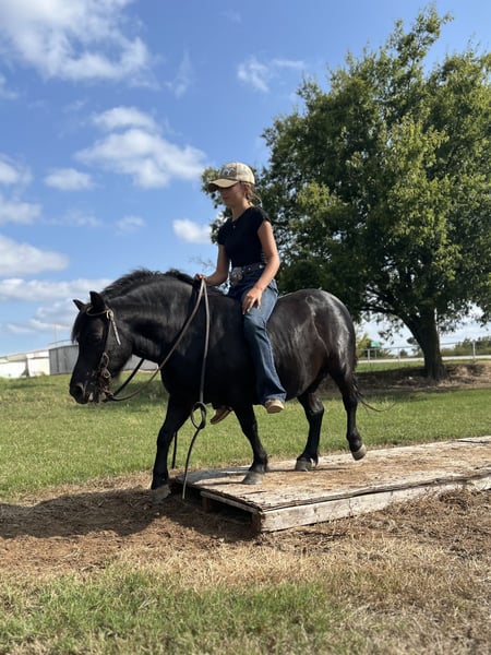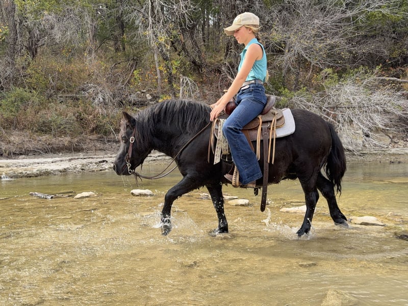 🎁 𝐈𝐍 𝐓𝐈𝐌𝐄 𝐅𝐎𝐑 𝑪𝒉𝒓𝒊𝒔𝒕𝒎𝒂𝒔 🎁 Happening now thru TUESDAY | DECEMBER 9th - Available EXCLUSIVELY on Ponybid's website! For more details and to register visit: www.Ponybid.com CONSIGNOR CONTACT: Ponies & Ponytails 727-741-0559 LOCATION: Cleburne, TX BREED: Draft pony REGISTERED: No COLOR: Black HEIGHT: 10.3 AGE: 8 GENDER: Gelding If you’ve ever dreamed of having a draft horse for the kiddos.. look no further!! Little Porkchop looks like you left the Percheron in the dryer too long! 8yrs old standing a whopping 10.3h tall he’s is legitimately as wide as he is tall!! Porkchop is the ultimate trail pony for the kiddos! He is perfect from the leadline, to the ponying from the big horses to teaching the kiddos to ride out alone! He goes anywhere you point him and follows the big horses over, under and through anything! Little Porkchop will not only pack the little western saddle but he also rides English and bareback as well. He even goes over the little jumps!! Easy to walk, trot, canter for the kiddos and catches his leads. Porkchop is great on the ground. He stands quietly for grooming, washing and saddling. He’s also great for fly spray and show sheen. Porkchop has a very friendly, very bubbly personality. He loves attention, he loves being brushed and obviously he loves getting cookies! Porkchop is a very easy keeper. He’s currently eating just a little alfalfa hay twice a day. No grain or supplements. Porkchop has excellent feet also. UTD on trimming and absolutely NO signs of founder in this little man! No bad habits or vices. No buck, kick, rear, bite or bolt. CHRISTMAS BOARDING AVAILABLE: We are offering boarding until Christmas time to really surprise the kiddos! If you need a place to stash your new stocking stuffer we can certainly make that happen!
