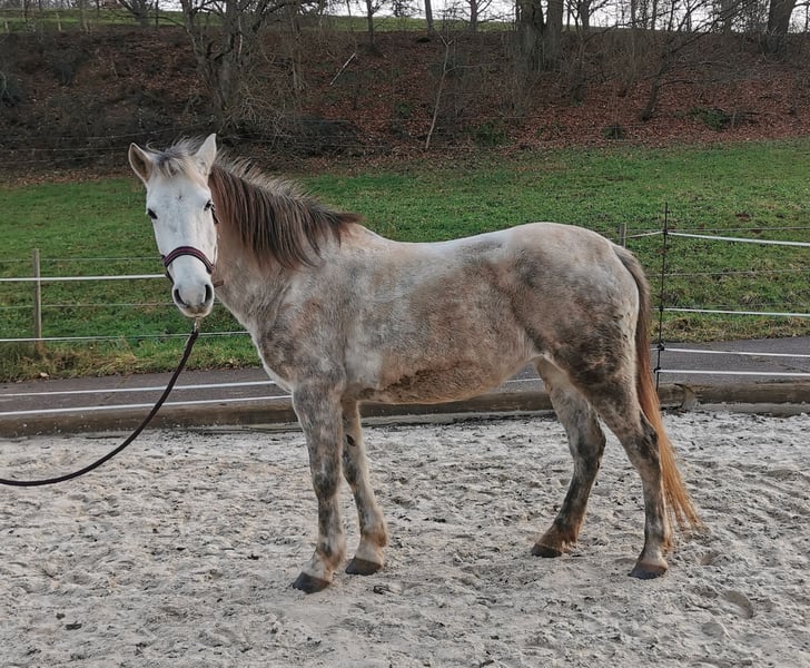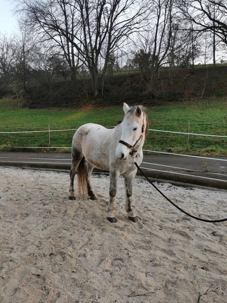 Stute 9 Jahre Stockmaß ca 1,40 m Geritten und gefahren Sie ist geritten, hauptsächlich allein im Gelände. Kennt aber auch Platz und Halle, sowie Gelassenheitstraining, Bodenarbeit oder extrem Trail und das macht sie auch alles wirklich großartig. Sie ist sehr unerschrocken. Im Gelände fragt sie schon mal ob sie den Weg bestimmen darf, deswegen würde ich sie nicht als reines Anfängerpferd sehen. Wer aber Unterstützung dabei hat oder einfach konsequent ist, wird das gut schaffen. Sie ist bei uns noch nie durchgegangen. Sollte sie wirklich mal unsicher sein, bleibt sie stehen. Ich finde sie besonders toll, wenn sie von Kindern oder Jugendlichen geritten wird. Dafür eignet sie sich hervorragend. Auch erwachsene Reiter/innen bis 1,70 m und 70 kg sind kein Problem, das schafft sie gut. In der Herde ist sie eher rangniedrig. Sie ist brav beim Tierarzt, Hufschmied und Hänger fahren. Sie kennt Hunde (die dürfen sogar unter ihrem Bauch durchlaufen), Katzen, Hühner, Kühe, Ziegen, tobende Kinder, Traktoren, Motorsäge, Feuer uvm. und zeigt sich dabei recht gelassen. Gefahren ist sie auch, allerdings nicht bei uns. Da ich sie aber beim Kennenlernen damals selbst gefahren bin, kann ich das mit Sicherheit sagen. Hier wurde sie ausgebildet von einem professionellen Trainer im Elsass, der viele nationale und internationale Titel hat. Sie hat einen Westernsattel und wird freizeitmäßig geritten (kann auf Wunsch auch gekauft werden). Aktuell geht sie Barhuf und steht im Offenstall. Im Sommer 24/7 auf der Koppel.