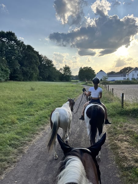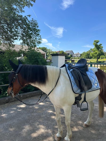 For sale is a beautiful, friendly pinto mare born in 2015. She stands approximately 12.5 hands high and is ideally suited for leisure riding. Whether for relaxed trail rides, walks, or further development in the riding arena – this mare is versatile and a wonderful companion. I initially purchased her for use in my small riding school. However, she quickly showed that she doesn’t handle insecure riders on the arena very well. With her riding partner, she is a dream pony and can do everything a horse girl’s heart desires. She goes out alone on trails, does groundwork and liberty work, goes for walks, bike rides, etc. When you understand her and respond to her, she is a lovely companion. Unfortunately, her riding partner has now become too large and heavy for her (she comfortably carries up to 60 kg). Therefore, I am now looking for the perfect forever home for her. This is not a distressed sale!! If the ideal home isn’t found, she will stay with me. However, I truly wish for her to be more than just a trail and groundwork horse. If you are interested or have further questions, I am happy to assist. I also have more photos and videos available upon request. I believe it’s best to meet her in person to see if the chemistry is right. I am open to visits after a short phone call. The sale price is negotiable!