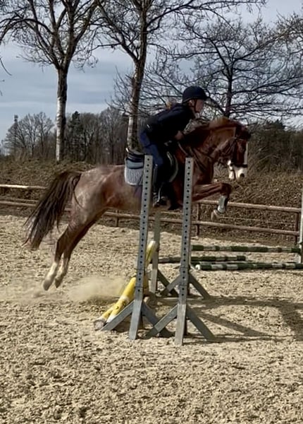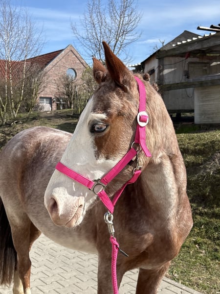 Wunderschönes Sportpony in seltener Farbe Red Roan mit blauen Augen! Zum Verkauf steht eine außergewöhnlich typvolle Sportponystute in der seltenen Farbe Red Roan mit wunderschöner Blesse, vier weißen Beinen und auffällig blauen Augen. Ein absoluter Blickfang mit Sportqualität. „Holde Maid“ ist 6-jährig, mit 1,41 m eingemessen und wurde schonend sowie altersgerecht ausgebildet und startet nun in ihre erste Turniersaison. Sie überzeugt durch ihre sehr guten Grundgangarten, ihre erkennbare Springveranlagung sowie ihre angenehme Rittigkeit. Sie zeigt sich sowohl im Springen, in der Dressurarbeit, im Gelände sowie auf fremden Plätzen stets nervenstark und unkompliziert. Dadurch ist sie sowohl für ein Kind oder ambitionierten Nachwuchsreiter als auch für einen kleineren Erwachsenen interessant. ✔ schmiedefromm ✔ verladefromm ✔ herdenverträglich ✔ klar im Kopf und leistungsbereit Ein vielseitiges Nachwuchspony mit Qualität, das nun den passenden Reiter sucht.