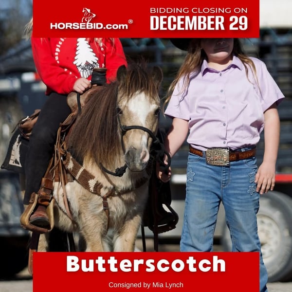 ⚜️𝐓𝐇𝐄 𝓗𝓮𝓻𝓲𝓽𝓪𝓰𝓮 𝐖𝐢𝐧𝐭𝐞𝐫 𝓒𝓵𝓪𝓼𝓼𝓲𝓬⚜️ Happening now thru MONDAY | DECEMBER 29th - Available EXCLUSIVELY on HorseBid's website! For more details and to register visit: www.Horsebid.com CONSIGNOR CONTACT: Mia Lynch (916)547-1198 LOCATION: Graham, TX BREED: Pony REGISTERED: No COLOR: Buckskin HEIGHT: 38 inches AGE: 8 GENDER: Mare Butterscotch is an 8 year old pony mare that is just as gentle as she is cute! She stands 38 inches tall. She leadlines like a champ and is good for all the little kids on the ground. She loads, leads, picks up all 4 feet, is easy to catch, is good around dogs, etc. Butterscotch loves attention and doesn’t have that typical pony attitude. Located in Graham, TX. Call me at (916)547-1198 for more information.