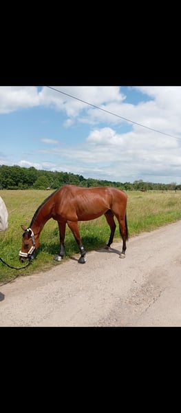 Johnny is an Irish Thoroughbred with a calm and friendly temperament, eager to please under saddle. We have not experienced him as particularly spirited, but he is not malicious or overly spooky; he is always manageable. In the arena, he moves confidently in all three basic gaits and has also jumped a few small fences, showing a decent attitude. He requires an experienced rider who can provide him with security and knows what they are doing. With further training, I can see him potentially suitable for beginners, but that would require some work, which we unfortunately do not have the time for. Feel free to contact me via private message for further questions. The price is negotiable; however, we are not giving him away. He can be placed in good hands. Life and invalidity insurance can be arranged, as well as a surgery insurance. He is available for a trial ride for €25 and can also be pre-ridden.