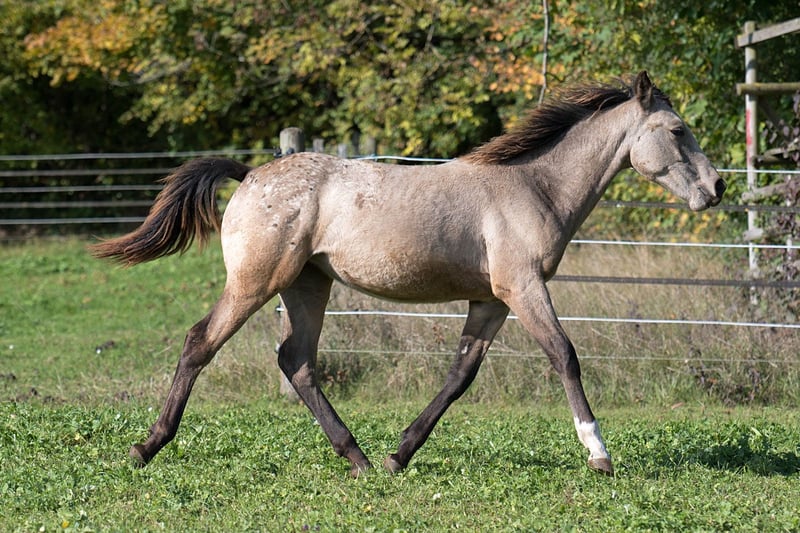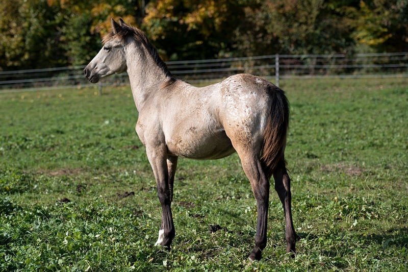 , sociable and with plenty of "gait" — she regularly displays a smooth gait in the pasture — and additionally in the highly sought-after, rare color BUCKSKIN! Nuna is a healthy, top-fit, perfectly conformed gaited horse resulting from the cross between Pataha (Foundation Appaloosa) and Ayita (Rocky Mountain Horse). She carries a copy of the DMRT3 gait gene, which means she has a genetic predisposition for gaited movement (Tölt/Rack). She has full, regular papers issued by the Walkaloosa Horse Registry USA. Her 6-Panel test through her sire (Foundation Appaloosa) is negative, indicating she is not a grey (and will not grey out). Buckskin is not just a distinctive coat color. Historically, Buckskin horses are renowned for numerous outstanding qualities and strengths, which are believed to trace back to their genetic heritage from Spanish Sorraia horse lines around 1500. Buckskin horses are known as "hard workers." They are said to possess greater endurance, determination, very strong hooves (sometimes described as steel-shod), stronger bones, and generally to be tougher and more resilient than other horses. The phrase "tough as wet leather" aptly describes true Buckskins. Finally, they are also well-known for their attractive coloration, often seen in Western films. Additional photos can be viewed on the website of the Doublefoffestranch.