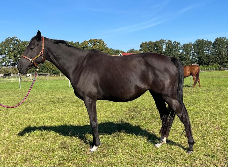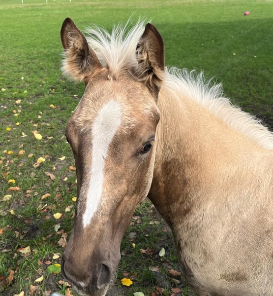 For sale is an exceptional Palomino filly with a rare pure thoroughbred lineage, registered with the Oldenburg Horse Breeding Association. A rare color treasure with sporting potential. She combines the elegance and toughness of a thoroughbred with a modern, athletic conformation, complemented by a golden coat that makes her a real eye-catcher. People-oriented, the filly knows the basics: halter training, farrier, and trailer loading. She is self-assured, strong-minded, and fearless, with very good musculature. Currently, she lives with her mother and two uncles in a herd. Snowy's Cristobal xx has been successfully competed in show jumping and cross-country events and impresses with his good character. Lou's Lillyfee is performance-tested with the OS (foal premium). She has already produced a very typy and strong-minded 3-year-old buckskin son by Quaside. Prospects: Ideal for breeding, eventing, or show jumping – perfect for connoisseurs who love the extraordinary. Also suitable for demanding hobby riders. She can be weaned mid-December (born June 28). Only to be sold to competent hands.