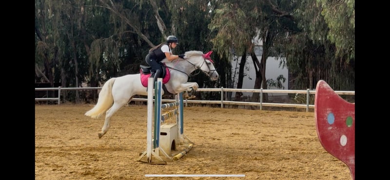 Silvia is an exceptionally special pony. 147 cm of balance, intelligence, and heart: a pony that works for you, forgives you, accompanies you, and helps you grow. She is the kind of horse every parent dreams of for their child and the ideal partner every trainer wishes to have in their stable. 💥 MAIN FEATURES - Height: 147 cm - Category: 115/125 cm with ample room for growth - Temperament: a remarkable head—always alert, cooperative, never confrontational - Heart: tireless, generous, always ready to assist - Jumping style: attentive, reactive, respectful - Handling: incredibly sweet, easy to manage, well-mannered, confident both in the stable and in the arena - Suitable for: perfect for young riders aiming to progress, ideal for gaining experience safely and targeting higher-level competitions