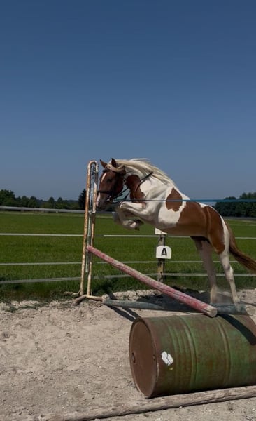 This beautiful mare with a friendly character offers a wide range of possibilities for various disciplines in the future. This young lady can jump 4 GG and can take care of any child due to her character. She is familiar with trail riding and is not spooky. Farrier and transport are not a problem. She is very uncomplicated in the herd. For further questions, feel free to get in touch.
