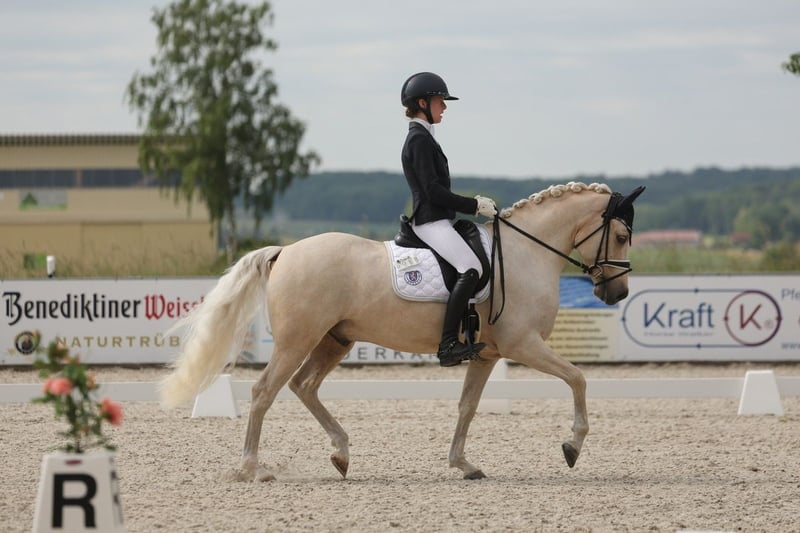 Glitzerflitzer is a reliable and calm pony that always provides a sense of security for its rider. Especially in walk and canter, he impresses with excellent quality, rhythm, and a comfortable seat. He has competed in several pony FEI classes, achieving placings of up to 69.**%, consistently demonstrating composure, nerves of steel, and motivation. In national competitions, Glitzi has won multiple L-level dressage tests, with scores up to 8.5. He has also competed several times at the South German Pony Championships and the Hessian Championships. He is very well-behaved in handling, clear-headed, and remains calm in new situations, whether at competitions, during training, or in everyday life. Glitzi always wants to please his rider and works with motivation. He provides his rider with a lot of confidence and is ideally suited for an ambitious young rider who wishes to continue competing in the sport.