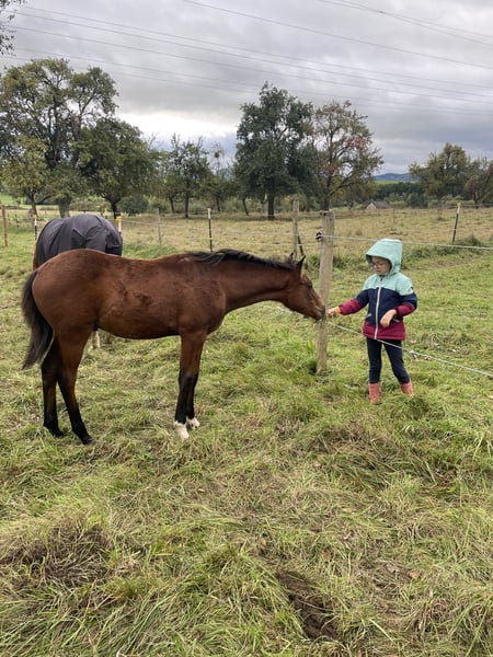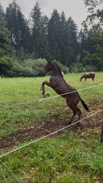 Zum Verkauf steht ein wunderschöner brauner Deutscher Reitpony Hengst von Der Zauberlehrling. Aufgrund seiner Abstammung ist er bestens für den Dressursport geeignet und bringt viel Talent sowie Lernbereitschaft mit. Seine Großmutter mütterlicherseits wurde 3-jährig Freispringchampioness und auch seine Mutter zeigt viel Talent am Sprung. Sie wurde 3-jährig angeritten und ist seit einer Koppelverletzung Zuchtstute. Unter dem Sattel zeigte sie sich überaus rittig und brav. Seine Halbschwester war Gold- und Siegerfohlen auf der Fohlenschau. Aufgrund einer Verletzung meinerseits war eine Vorstellung auf der Fohlenschau mit ihm leider nicht möglich. Der Hengst wächst in einer gemischten Herde auf, ist gesund, gut sozialisiert und zeigt sich im Umgang äußerst freundlich und aufmerksam. Meine kleine Tochter kann problemlos mit ihm umgehen. Selbstverständlich ist er entwurmt, wird regelmäßig dem Hufschmied vorgestellt und bekommt bestes Futter (Hafer+Iwest Mineralfutter) Bei Interesse oder für weitere Informationen stehe ich gerne zur Verfügung. Besichtigung nach Vereinbarung möglich.