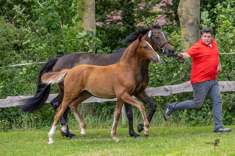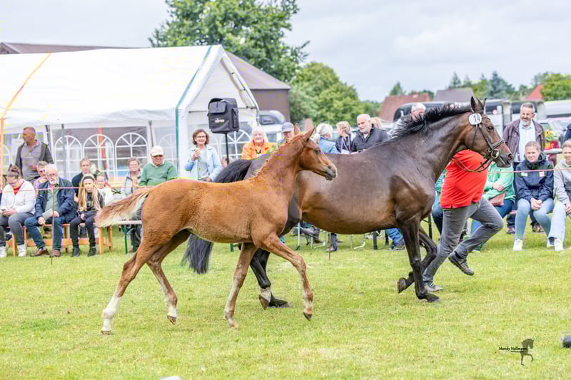 For sale is a promising German Riding Pony stallion, born in 2025. With his attractive chestnut coat and an estimated final height of 150 cm, he is not only a real eye-catcher but also a talented partner for dressage. This stallion impresses with his quality of movement and pleasant temperament. He is well-mannered and already shows promising approaches in his training. He is well-socialized and familiar with other horses. The last pictures show the father, Neuseriem Deichkieker WE. If you are interested or have any further questions, please feel free to contact me. We look forward to your message!