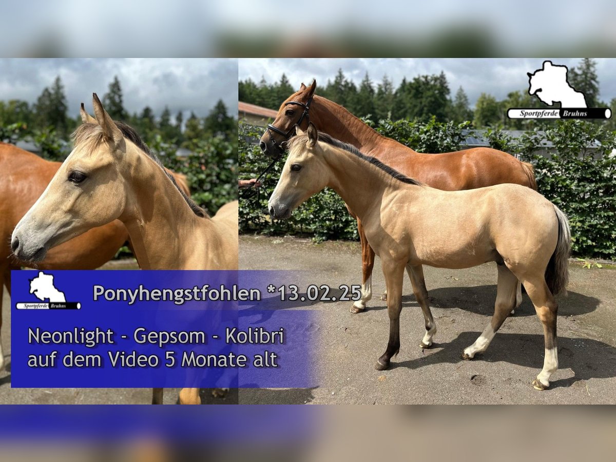Wij bieden een springgericht ponyhengstveulen in een bijzondere kleur, dat al laat zien waarvoor het is geboren. Een levendige en springgeïnteresseerde jongen die nu al weet hoe het moet. De vader, Neonlight, kwalificeerde zich vorig jaar voor de Bundeschampionat bij de springponys. De moeder is een te klein gebleven warmbloedmerrie die zelf succesvol was in springen tot en met klasse M. Ze is ook een dochter van een S/1,40m-winnende merrie, volle zus van een S/1,40m-springpaard en halfzus van meerdere S***/1,50m-springpaarden met succes. De grootvader van de moeder, Gepsom, was lange tijd onze sportieve nr. 1 in de stal en behaalde successen tot S****/1,55m niveau.