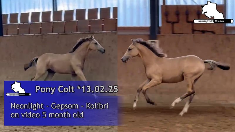Offriamo un puledro stallone pony con una particolare colorazione, che già dimostra per cosa è nato. Un ragazzo sveglio e appassionato di salto, che sa già come si fa. Il padre Neonlight si è qualificato lo scorso anno per il Bundeschampionat tra i pony da salto. La madre è una cavalla di sangue caldo rimasta di piccole dimensioni, che ha avuto successo in salti fino alla classe M e che è anche figlia di una cavalla vincitrice in S/1,40m, sorella piena di una cavalla di successo in S/1,40m e sorellastra di diversi cavalli da salto di successo in S***/1,50m. Il nonno materno Gepsom è stato a lungo il nostro numero 1 sportivo in scuderia ed è stato di successo fino al livello S****/1,55m.