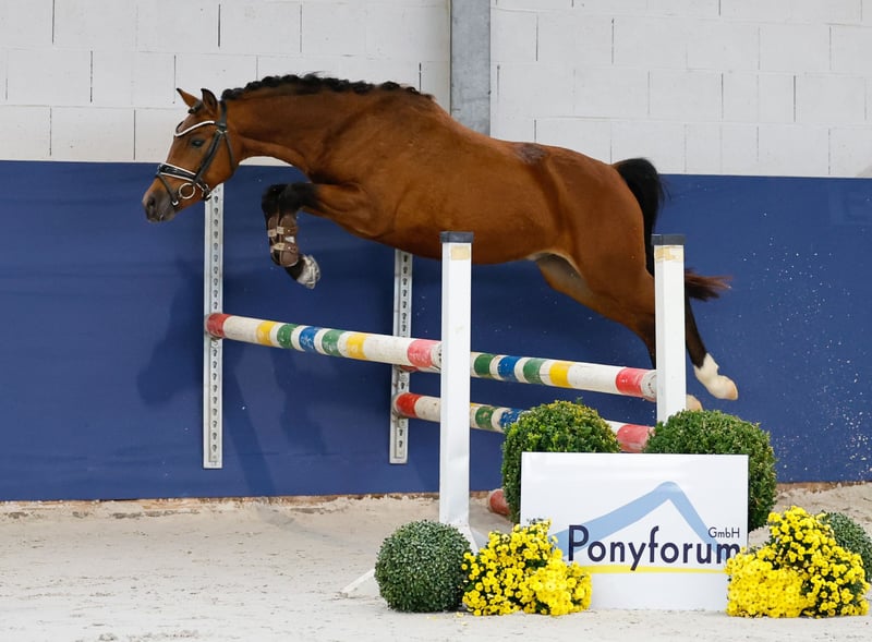 In unserer Kollektion stehen streng selektierte Youngster f�r alle Anspr�che: Ausbildungs-, Zucht- und Kinderponys Hier gelangen Sie zur Gesamtkollektion: https://ponyforum.auction Klein, aber oho! More of Hollywood ist ein zweijähriger Sohn des Doppelbundeschampion der Springponys, Mescal. Dieser Hengst startete nach seiner hocherfolgreichen Springponykarriere als Dressurpony weiter durch und ist aktuell in Dressurprüfungen bis zur Klasse S erfolgreich! Ebenso erfolgreich können sich auch die Nachkommen des Muttervaters Halifax seit Jahren im Spitzensport in Szene setzen, hier kommt also bestes Leistungsblut von beiden Pedigreeseiten. Hollywood zeigt sein Talent klar beim Freispringen, er agiert hier mit viel Übersicht und Mut.