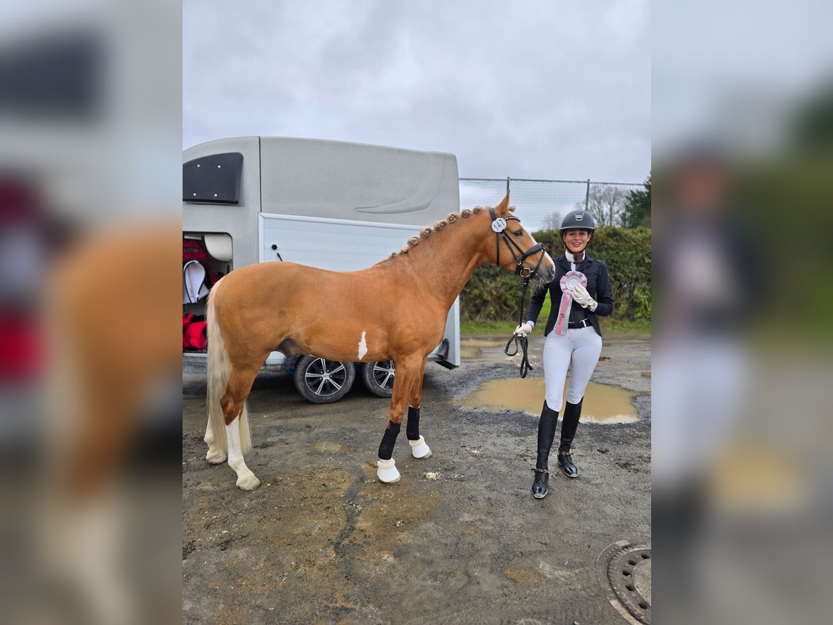 À vendre : un poulain palomino de 4 ans, au physique remarquable, mesurant environ 1,47 m (mesure officielle en janvier 2026). Next Chapter possède trois allures de base excellentes, a été monté en douceur et de manière bienveillante, et a déjà obtenu la deuxième place lors d’un concours de chevaux de sport en 2025, ce qui témoigne de sa bonne aptitude au défilé en camion. En mars 2026, il a de nouveau terminé à la deuxième place dans une épreuve de dressage. Notre "Happy" est un poney au type de cheval de sport, ce qui nécessite pour une jeune cavalière un accompagnement professionnel dans son éducation. Il est parfaitement calme au monté, confortable en selle et constitue un véritable trésor sous la selle. Il peut facilement être monté avec d’autres chevaux et se montre sage aussi bien seul qu’en groupe, en extérieur. Il est expérimenté avec des véhicules de toutes sortes. Il est très obéissant au maréchal-ferrant et chez le vétérinaire. Actuellement, (mars 2026), il est en formation adaptée à son âge et se révèle être une véritable boule de sport : très motivé, il aime travailler et cherche toujours à faire plaisir à son cavalier. Avec un encadrement approprié, c’est un super poney pour enfants, mais uniquement avec un accompagnement professionnel. Ce poney a été acheté brut en décembre 2024, et une inspection vétérinaire TÜV/AKU a été réalisée (en 2024) ; elle peut être consultée sur demande. Depuis lors, Next Chapter n’a montré aucune problématique de santé. Bien entendu, il est régulièrement vacciné et vermifugé, et ses dents ont été traitées en février 2026. Grâce à sa robe spectaculaire, sa couleur dorée brillante, son esprit sportif et sa silhouette harmonieuse, Next Chapter réalise aussi bien les rêves d’enfants que ceux de petites adultes. Un véritable partenaire de sport, doté d’un caractère irréprochable et d’un bon tempérament, qui, sous la bonne direction, n’aura aucune difficulté à briller même dans le grand carré. Les appels ne seront pris qu’à partir de 16h00.