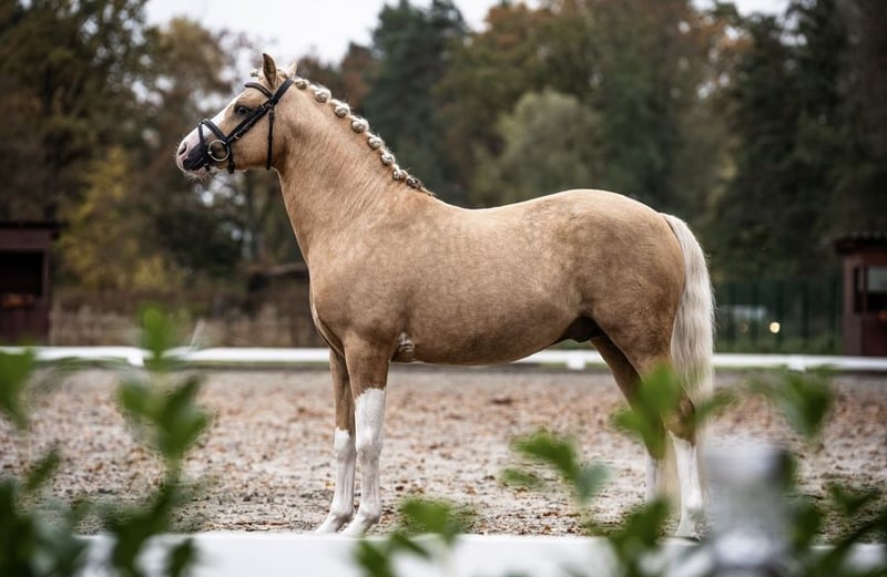 For sale is an exceptionally attractive riding pony stallion in the sought-after Palomino color. With his striking blaze and four high white socks, he captures everyone's attention. Despite his stallion status, he is very easy to handle in daily life and shows no typical stallion manners. He is very well-behaved at the blacksmith and loads effortlessly. The stallion is easy to ride and impresses with his rideability and pleasant temperament. He already masters all movements of class L and is suitable for both ambitious leisure riders and those starting in competitions. He comes directly from the breeder. Unfortunately, he has not reached his full height. If you are interested or would like more information, we look forward to hearing from you.