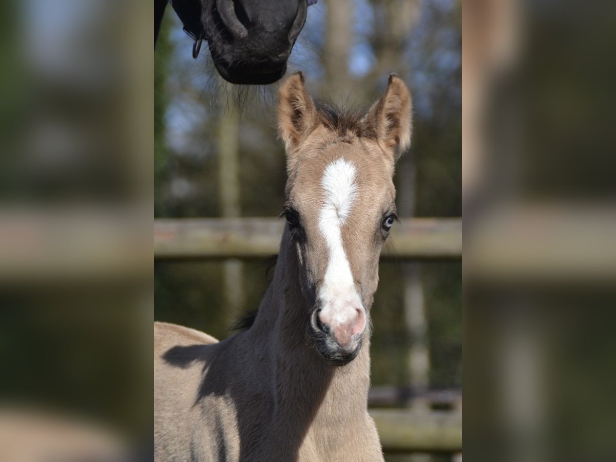 XXL Pony (Deutsches Reitpony x Hannoveraner Warmblut) mit dem gewissen Etwas! Traumhaft schön in heller Buckskin Jacke (braunisabell), 4 weißen Füßen, Blesse und einem besonderem Auge. Sehr zutraulich und aufgeschlossen dem Menschen gegenüber. Geschätztes Endmaß um die 155cm Auf den Fotos 1-5 Tage jung