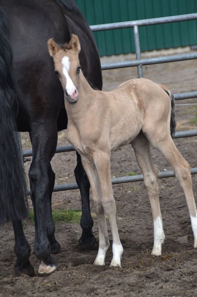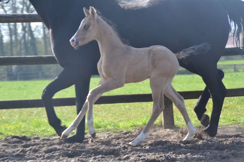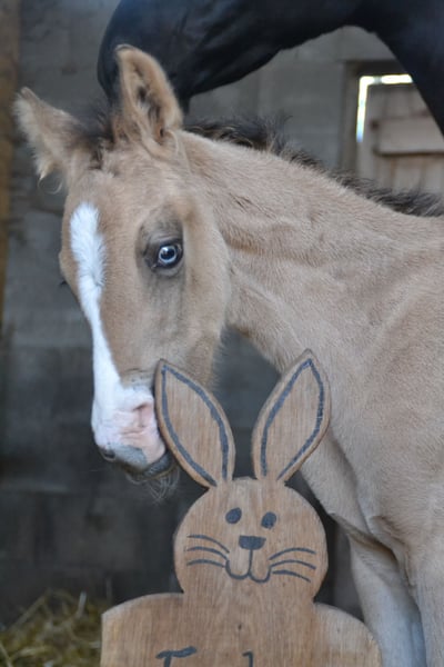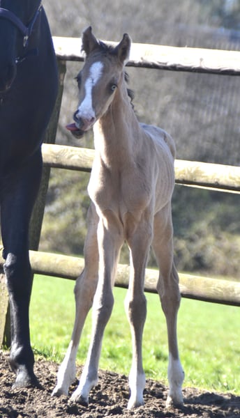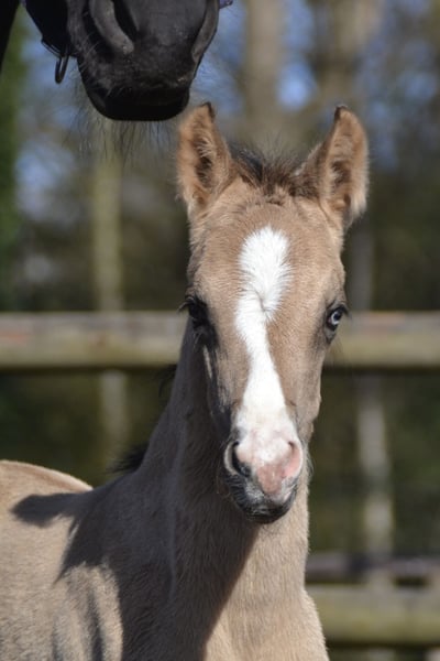 XXL Pony (German Riding Pony x Hanoverian Warmblood) with that certain something! Stunning in a light buckskin coat (brown sabino), with four white legs, a blaze, and a particularly expressive eye. Very friendly and approachable towards people. Estimated final height around 155 cm. Photos 1-5 show the pony as a few days old.