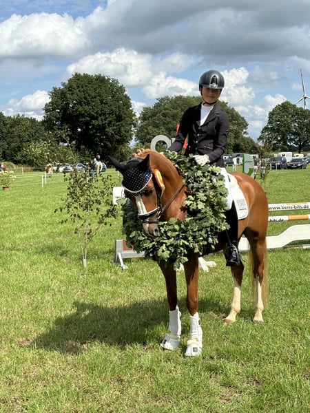 Wegen Umstieg auf's Großpferd trennen wir uns schweren Herzens von unserem talentierten Ponywallach. *** Platz vor Preis *** Bildschön aufgemachter Welsh-Reitpony-Wallach, der mit drei sehr guten Grundgangarten und einem tollen Charakter aufwarten kann. Siege und Platzierungen in der Dressur von A (A* + A** siegreich) bis L*. Aufgrund des raschen Wachstums seiner jungen Reiterin konnten wir sein ganzes Potenzial leider nicht ausschöpfen. Auf dem Turnier stets lektionssicher und ein echter Hingucker. Leider endet unsere Ponyzeit früher als geplant, so dass wir uns für unser Traumpony ein neues 5-Sterne-Zuhause wünschen, wo er einem weiteren Ponykind zum Einstieg in den Sport verhelfen kann und täglich Freude bereiten wird. Mit seiner perfekten Größe von 148 cm (Lifetime-gemessen) deckt er sehr gut ab, ist aber kein Gewichtsträger. Bei weiterer sportlicher Förderung kann er seinem zukünftigen Reiter(in) zu vielen Erfolgen im Ponysport verhelfen und zudem ein toller Freund und Partner sein. Er geht einfach und sicher in Anlehnung, ist sehr sitzbequem und kann dadurch auch von schwächeren Reitern geritten werden. Auch im Springen, zeigt er Talent, von uns jedoch nicht turniermäßig vorgestellt. Im täglichen Handling absolut unkompliziert: Abteilungsreiten, Verladen, Auswärtstrainings, Lehrgänge, Hufschmied, regelmäßige Ausritte (auch alleine), ohne Sattel oder mit Halsring reiten, Stoppelfelder.... er ist für jeden Spaß zu haben. Er steht bei uns in einer gemischten Herde (im Sommer tagsüber auf Weide, im Winter auf Paddocks), war nie krank und ein sehr guter großer TÜV (o.B.) aus 2022 liegt vor. Nur in nachweislich gute und fördernde Hände, ggf. inkl. Zubehör.